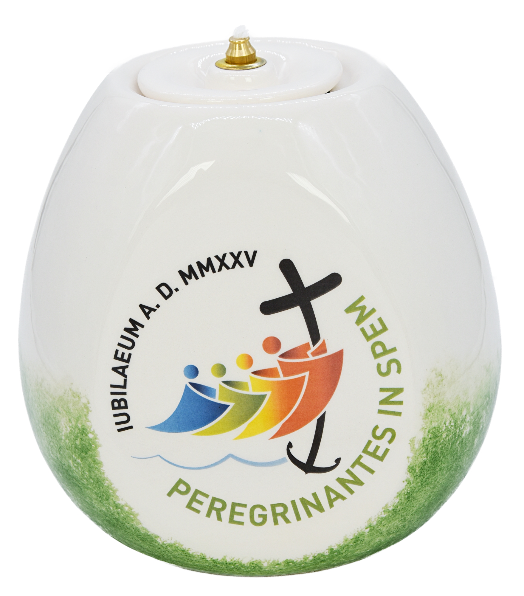 Large ceramic oil lamp decorated with official logo of the Jubilee Year hand decorated.