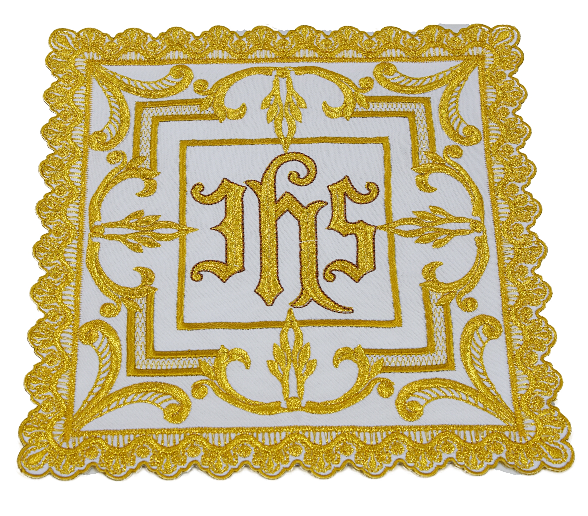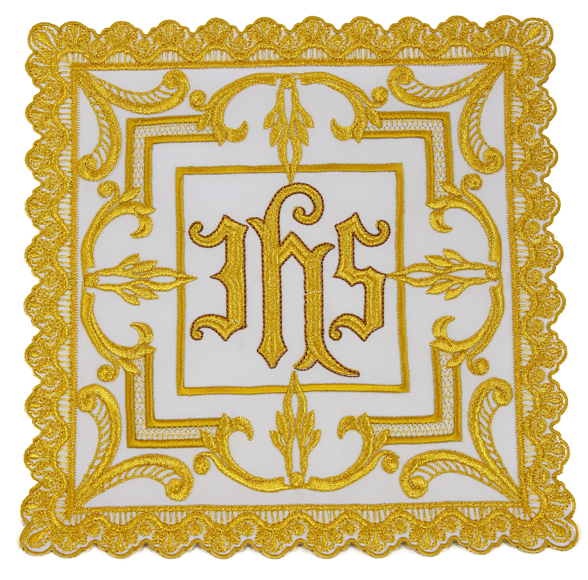Chalice pall richly embroidered with gold and silk threads.