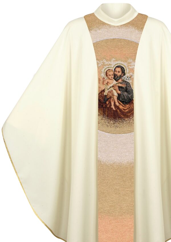 The orphrey scapular, depicting the portrait of Saint Joseph and Child, is obtained with fine crafting on a frame.