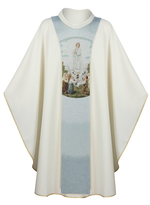 It features a loom-embroidered scapular depicting the Apparition of the Virgin at Fatima.