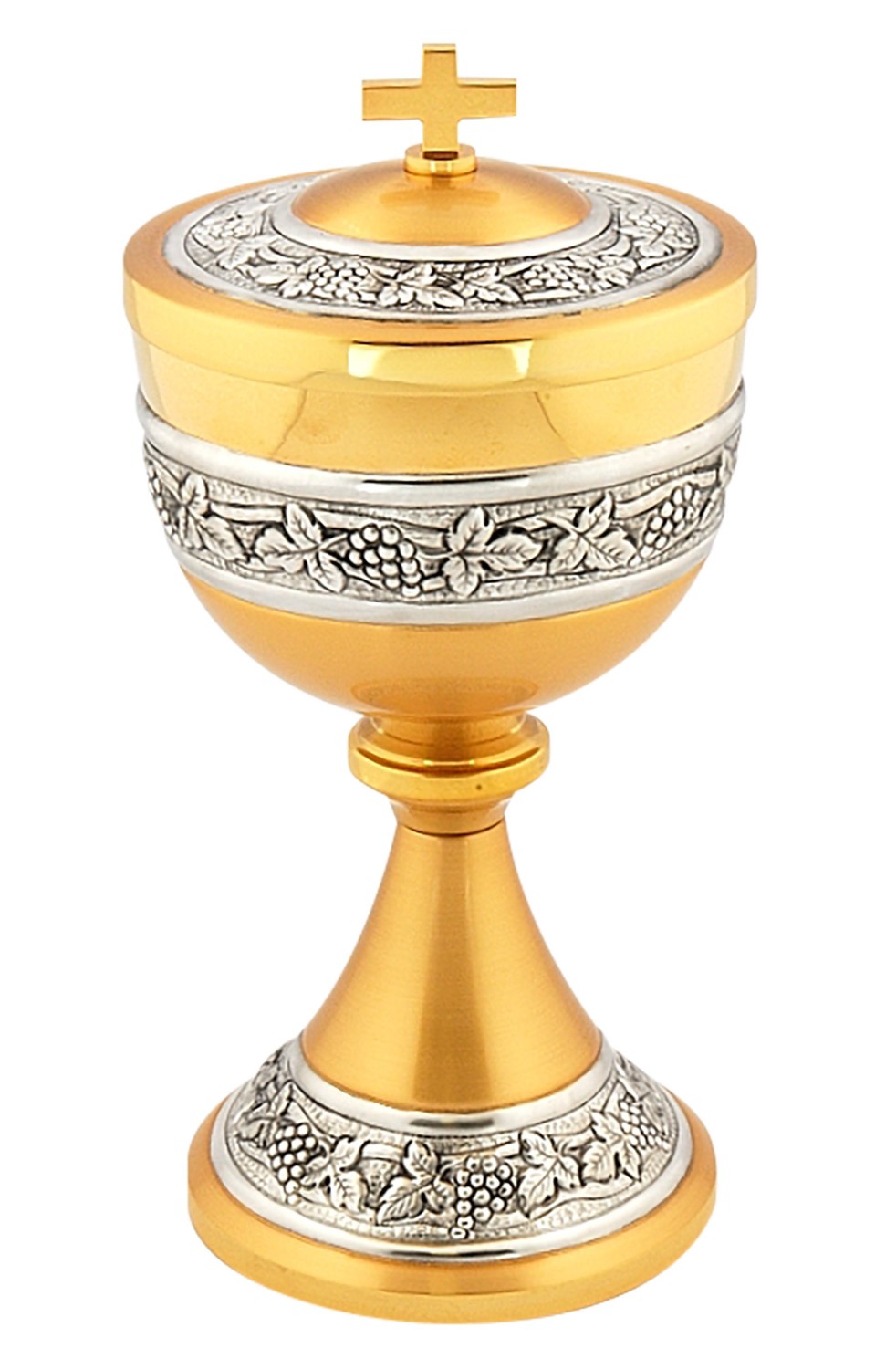 Ciborium with cup, base and lid embellished with a hand-engraved garland of grapes and vine leaves.