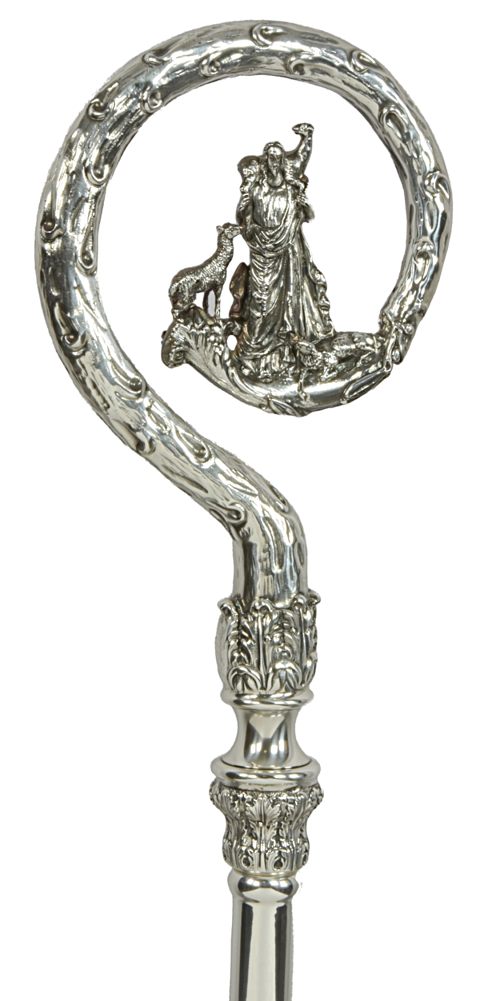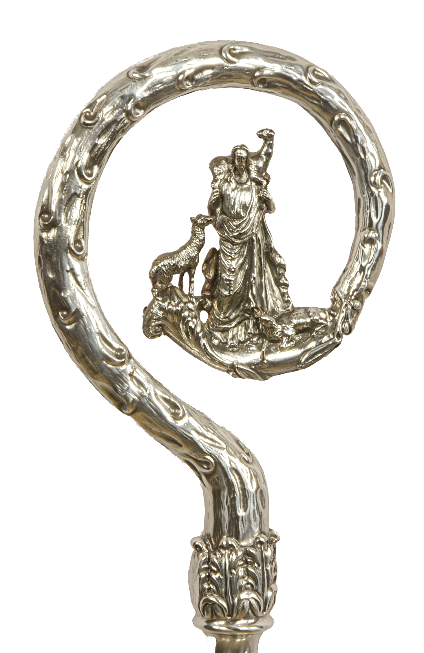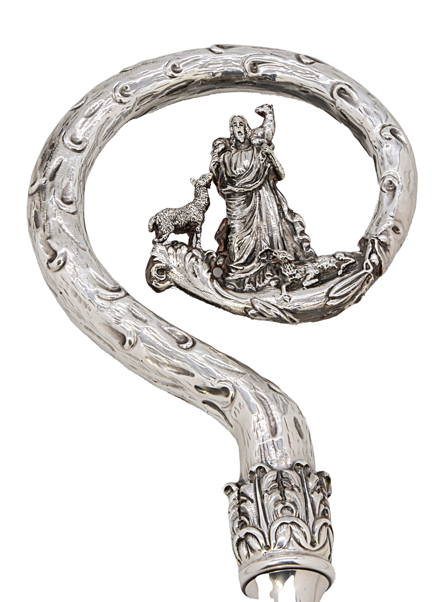 In silver plated brass, finely engraved and with the symbol of Jesus the Good Shepherd in cast bronze.