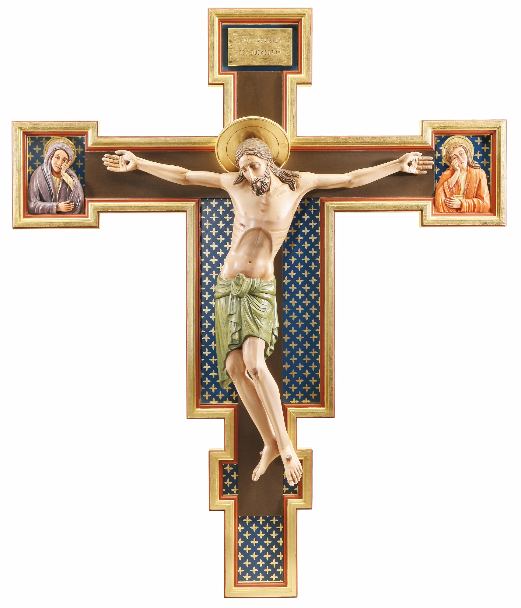 This solid wood crucifix is an authentic example of fine artistic craftwork, in 11th century Byzantine style, it is reminiscent of the work of Cimabue.