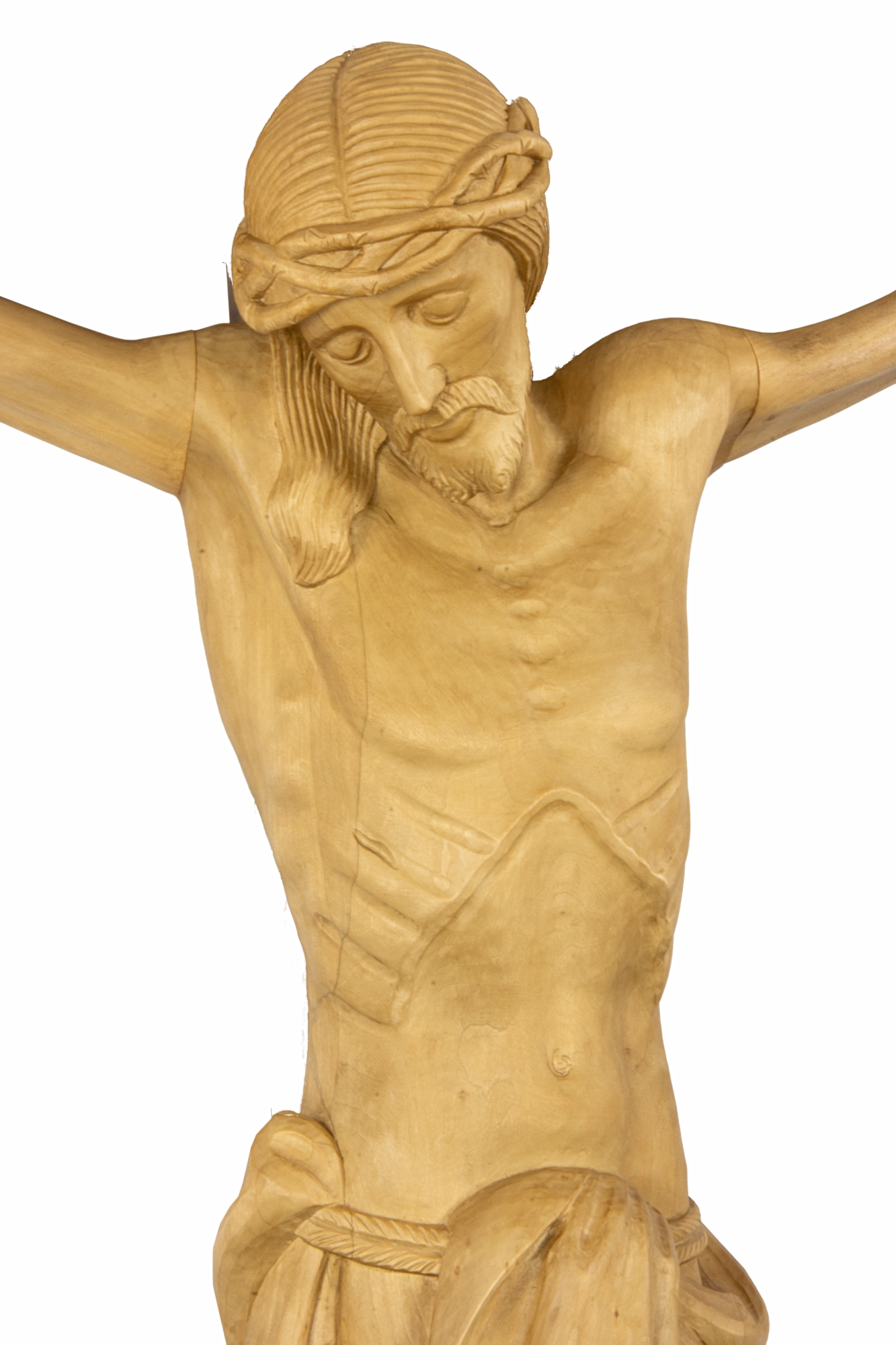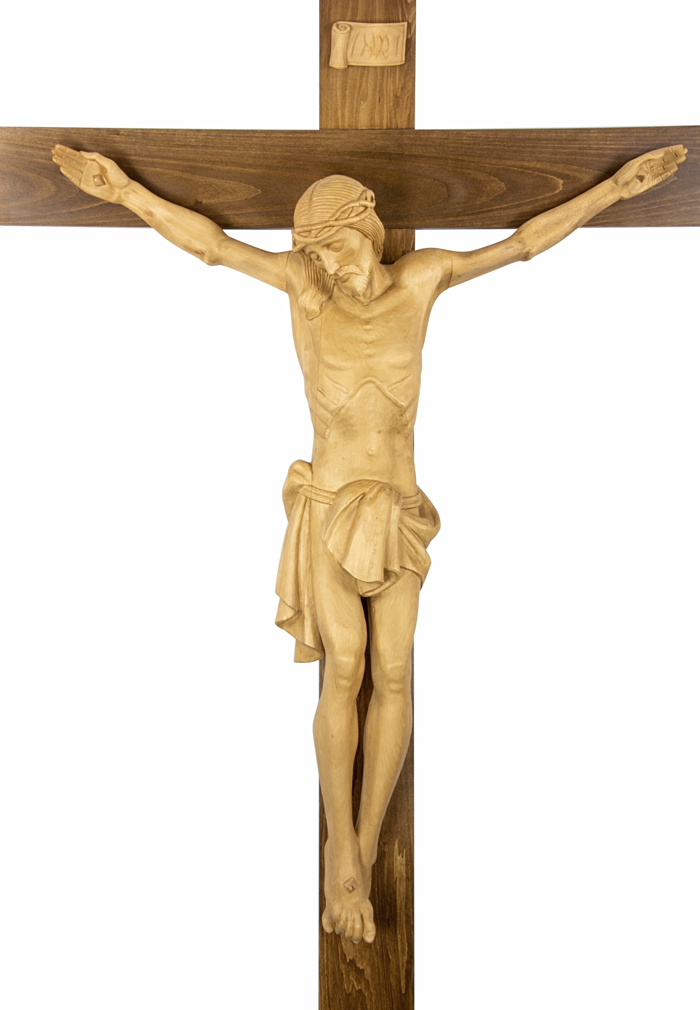 crucifix sculpted in lime wood coated in different shades, body measuring 120 cm, while the cross measures 240 cm.