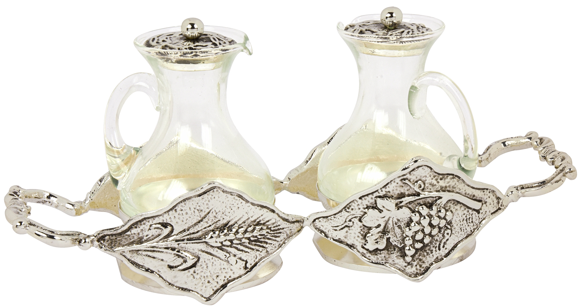 The two blown glass cruets are placed in special housings in silver casting.