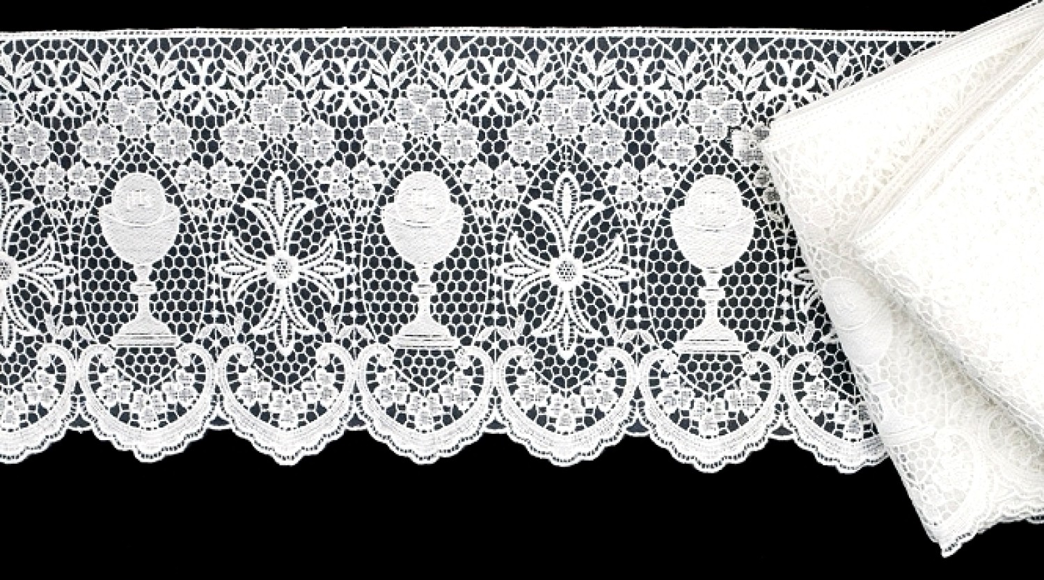 Prestigious organza lace with precious cutwork embroidery o Eucharistic symbols.