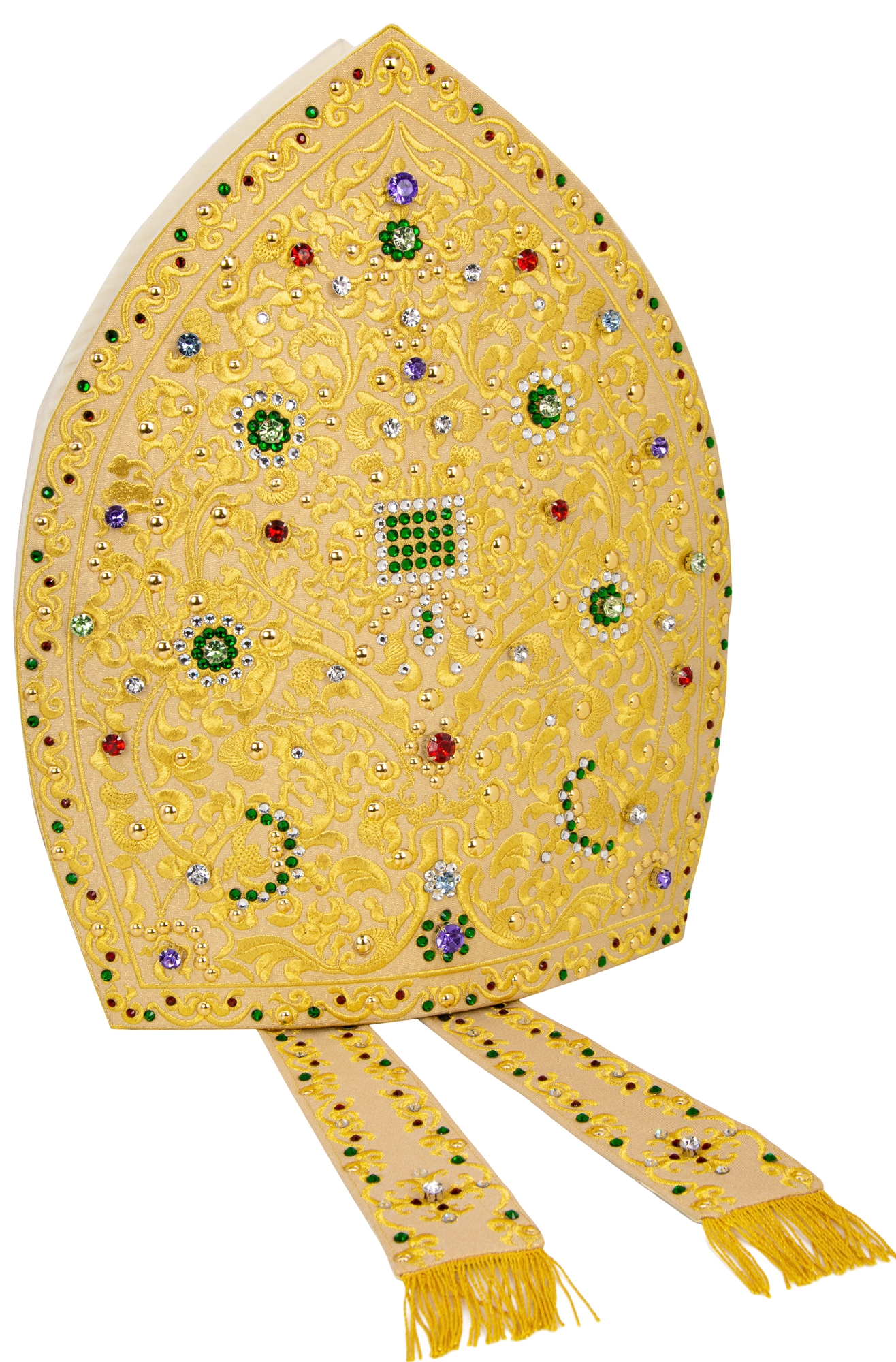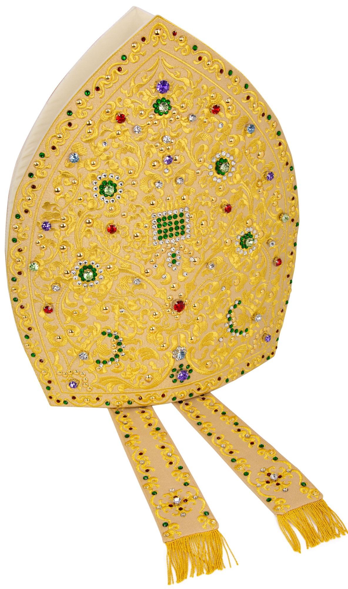 It features a very rich embroidery executed in gold thread and enriched with a large number of multicoloured stones, rhinestones and swarovski that form little flowers and other ornamental motifs.
