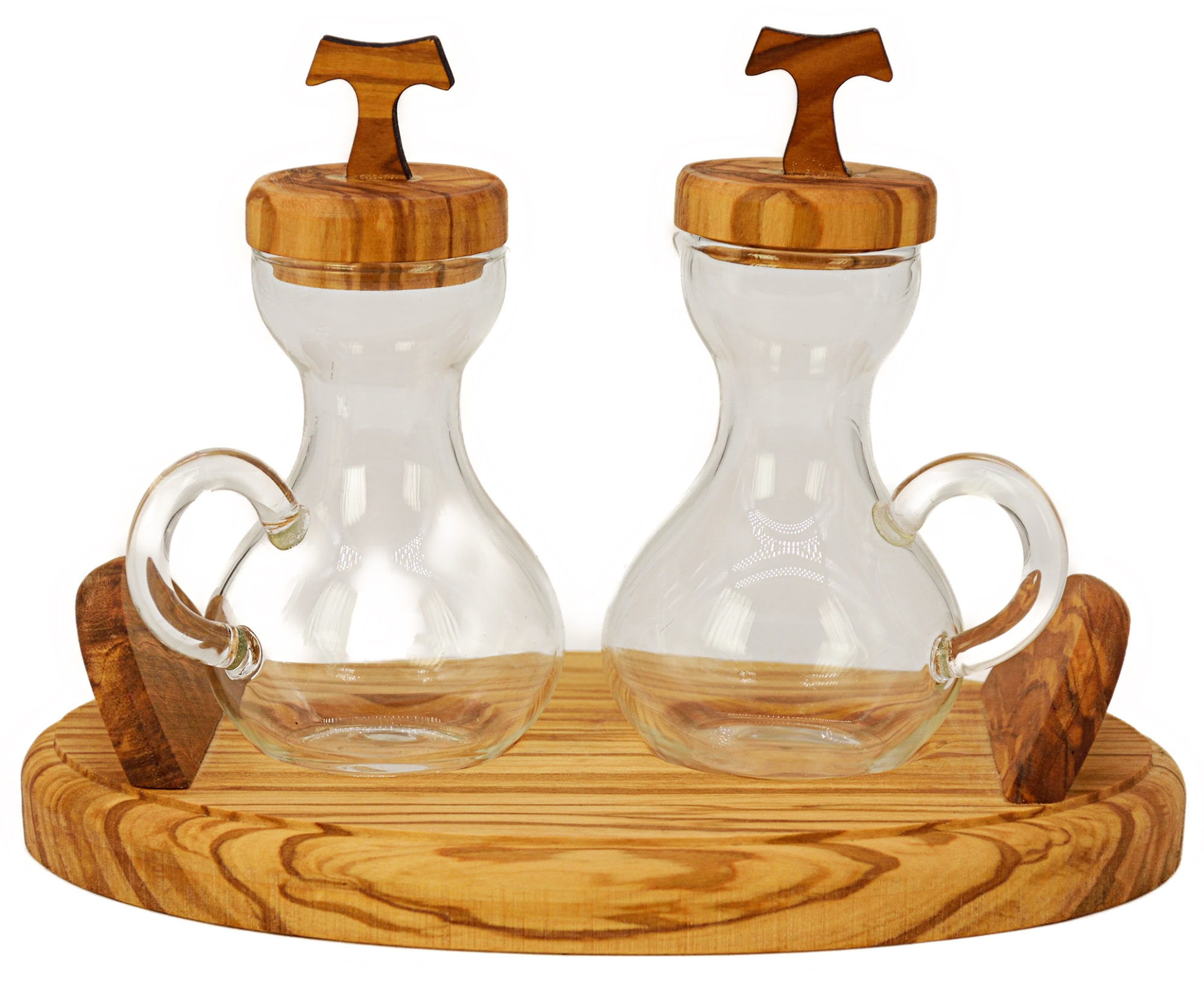 Artistic service of cruets with olive wood tray and crystal jugs.