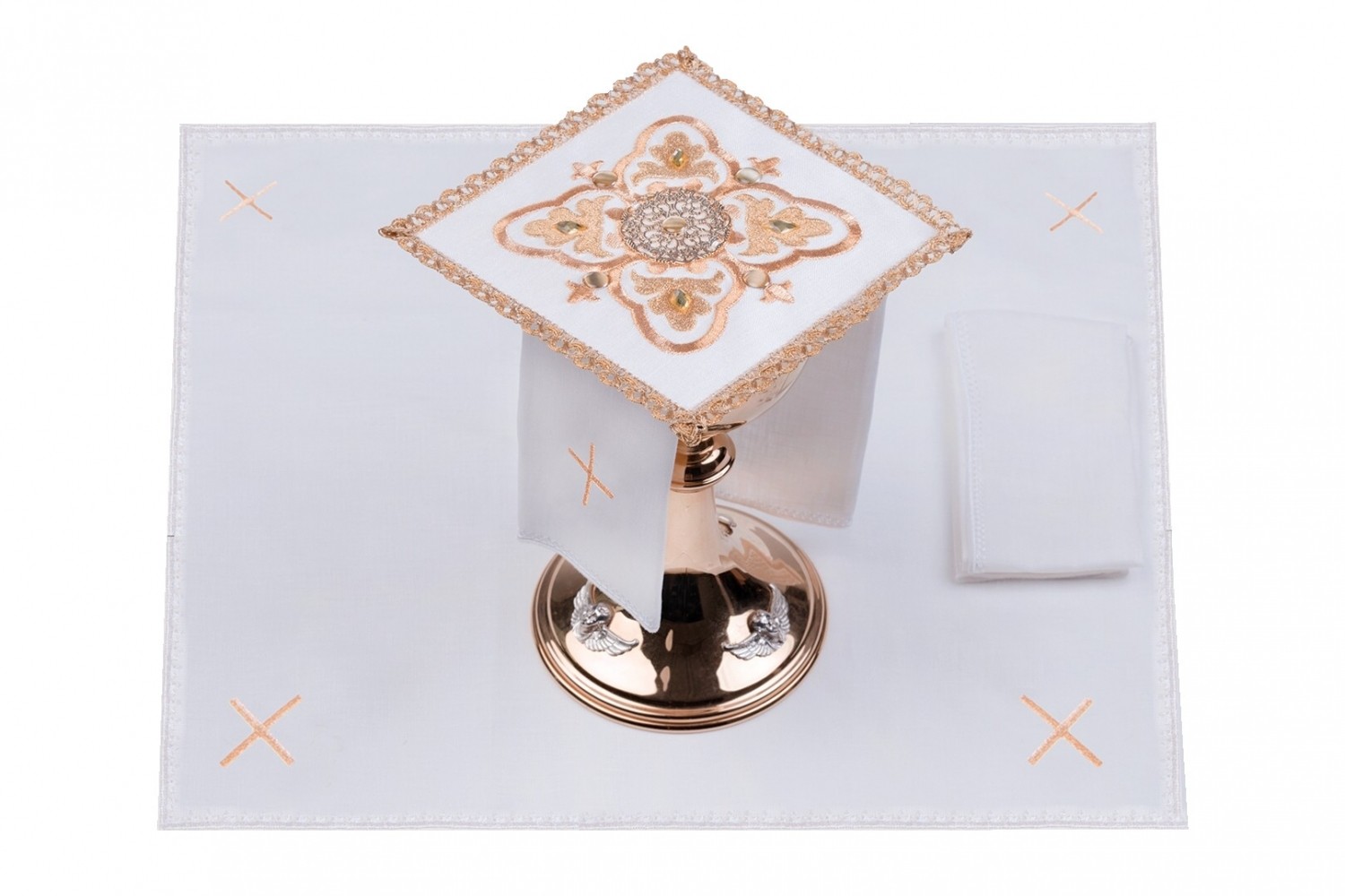 Complete set includes chalice pall, purificator, corporal and lavabo towel.
