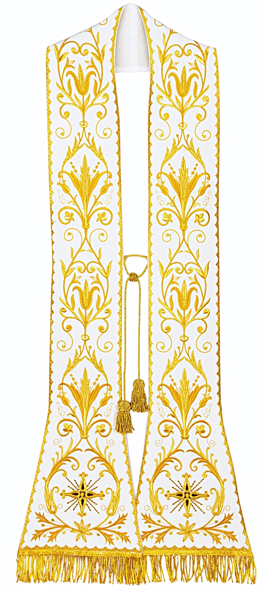 Formal stole entirely embroidered with gold threads featuring baroque decorations.