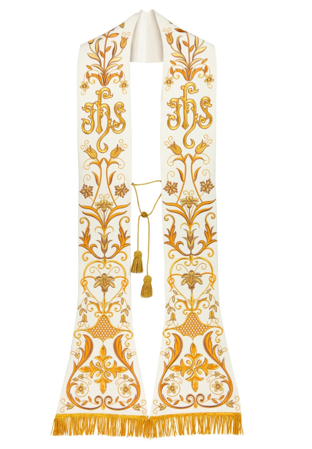 Formal stole entirely embroidered with gold threads featuring baroque decorations.