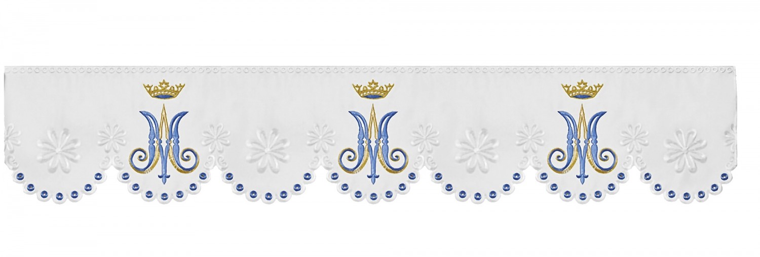 Embroidered trimming for altar tablecloths with embroidery in colored and gold threads of Marian symbols.