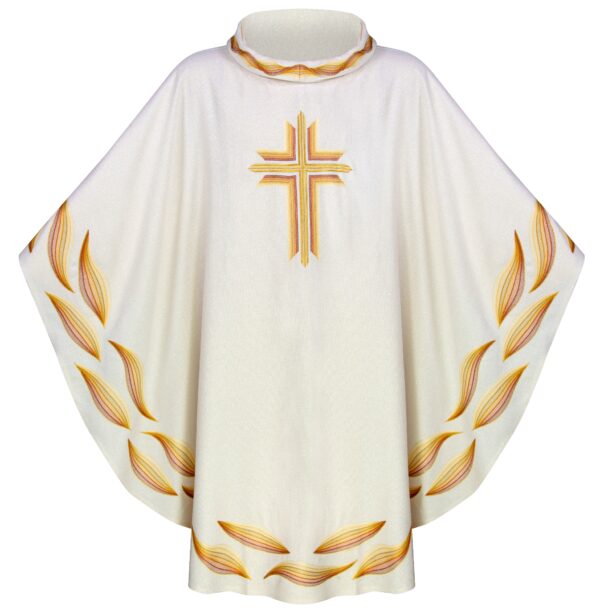 La casulla presenta en ambos lados un elaborado y delicado bordado realizado con hilos en tonos suaves que combinan con el color litúrgico correspondiente.