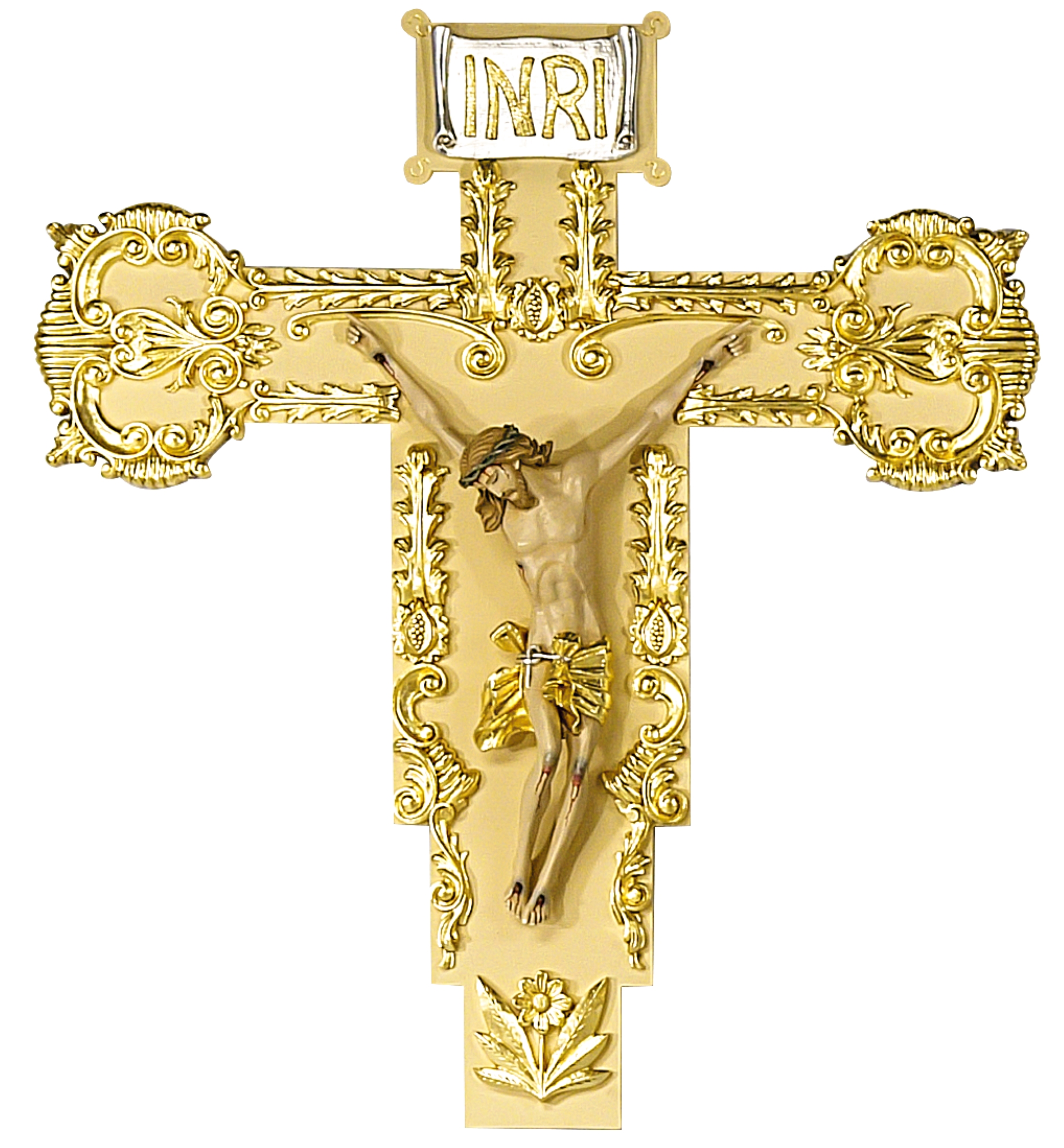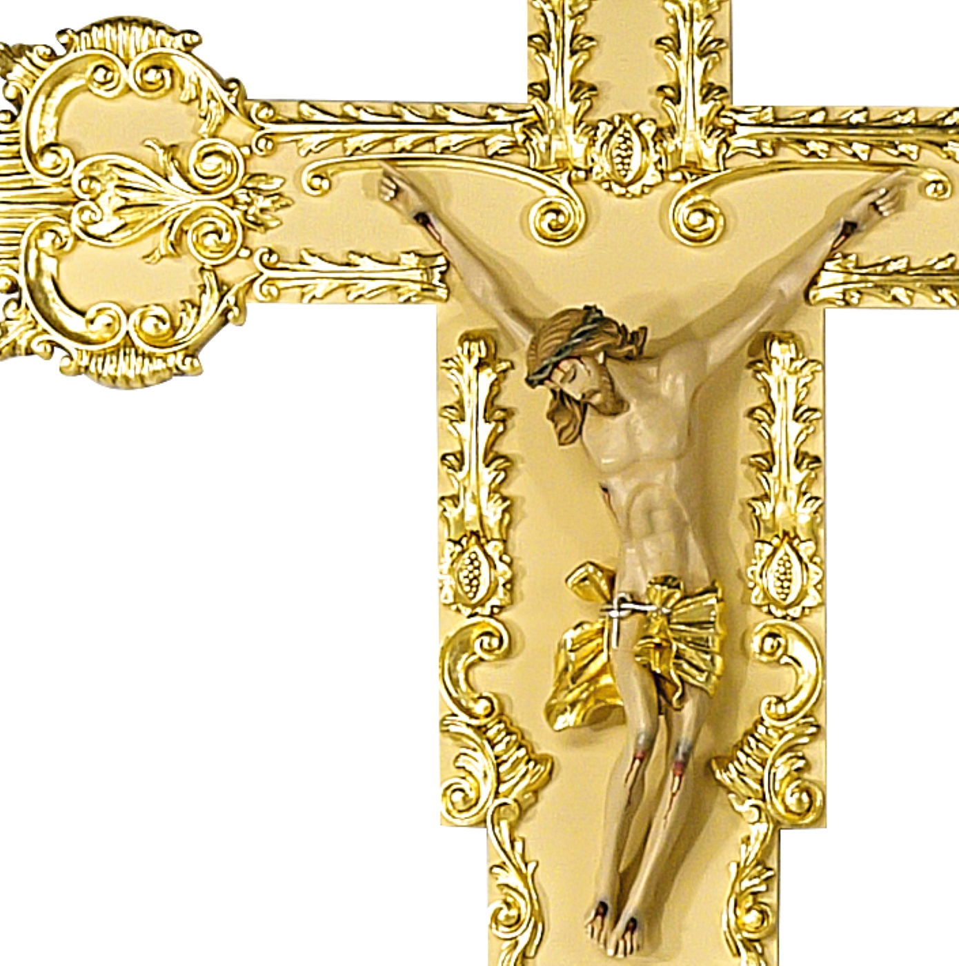 La cruz de madera lacada está adornada con numerosos frisos de madera tallados a mano y dorados.
