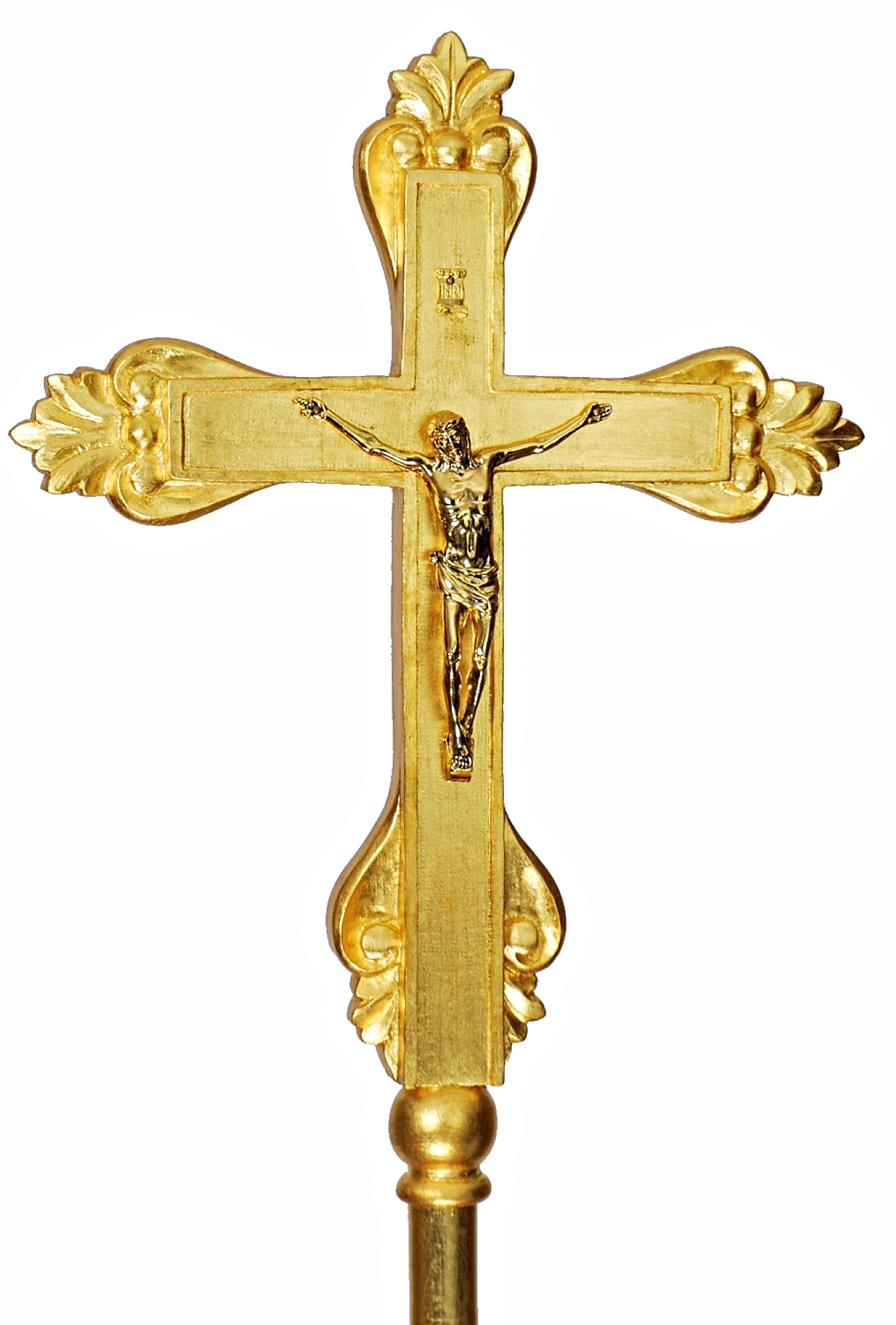 Con cantoneras armoniosamente esculpidas, está dorada con hoja de oro. Cuerpo de Cristo en metal plateado. Tamaño 50 x 37 cm, más el asta en madera de 150 cm de altura.