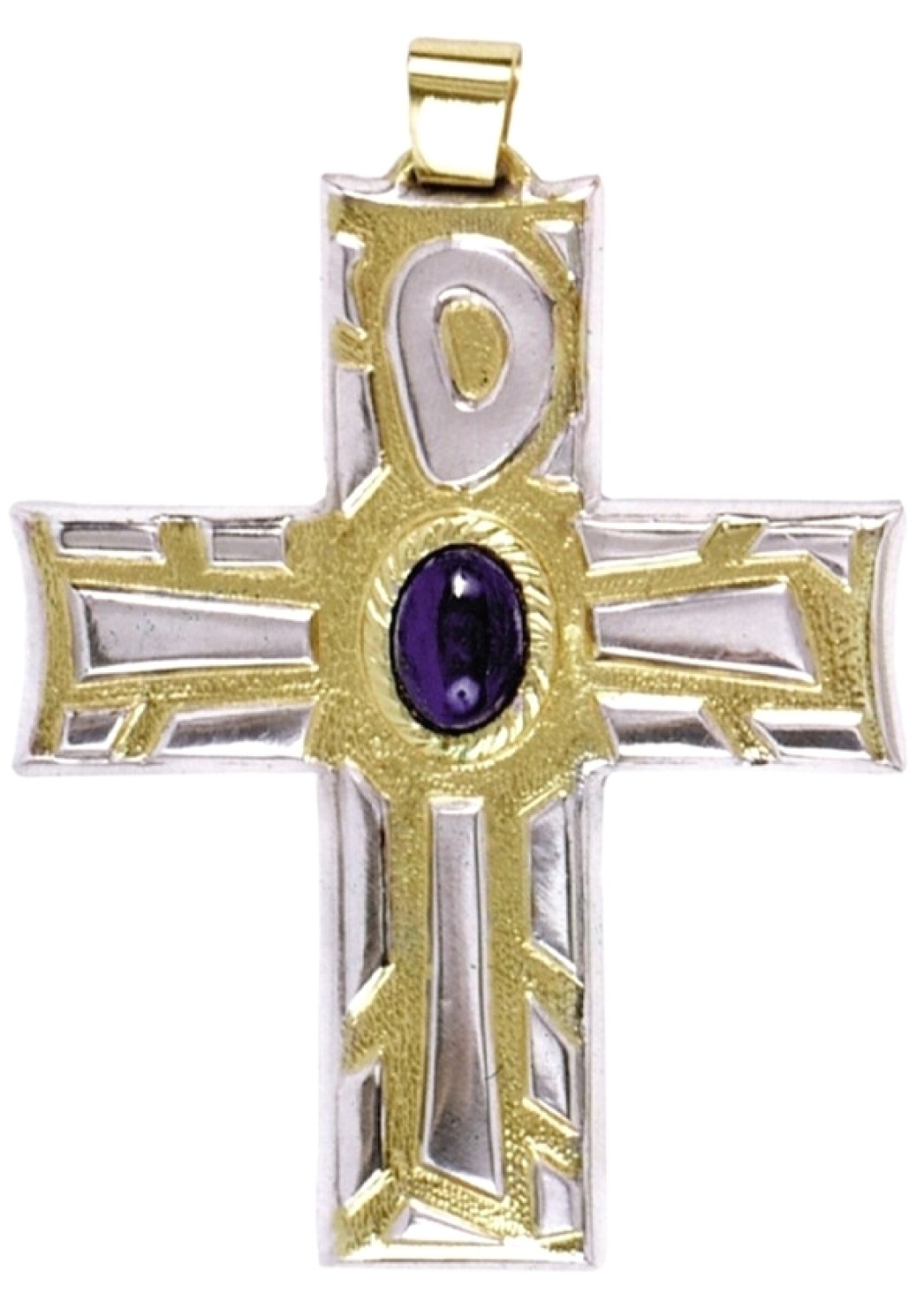 Cruz pectoral en metal con decoración en oro y plata bicolor.