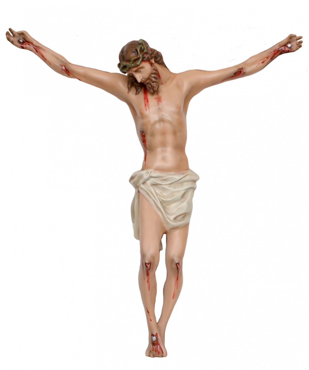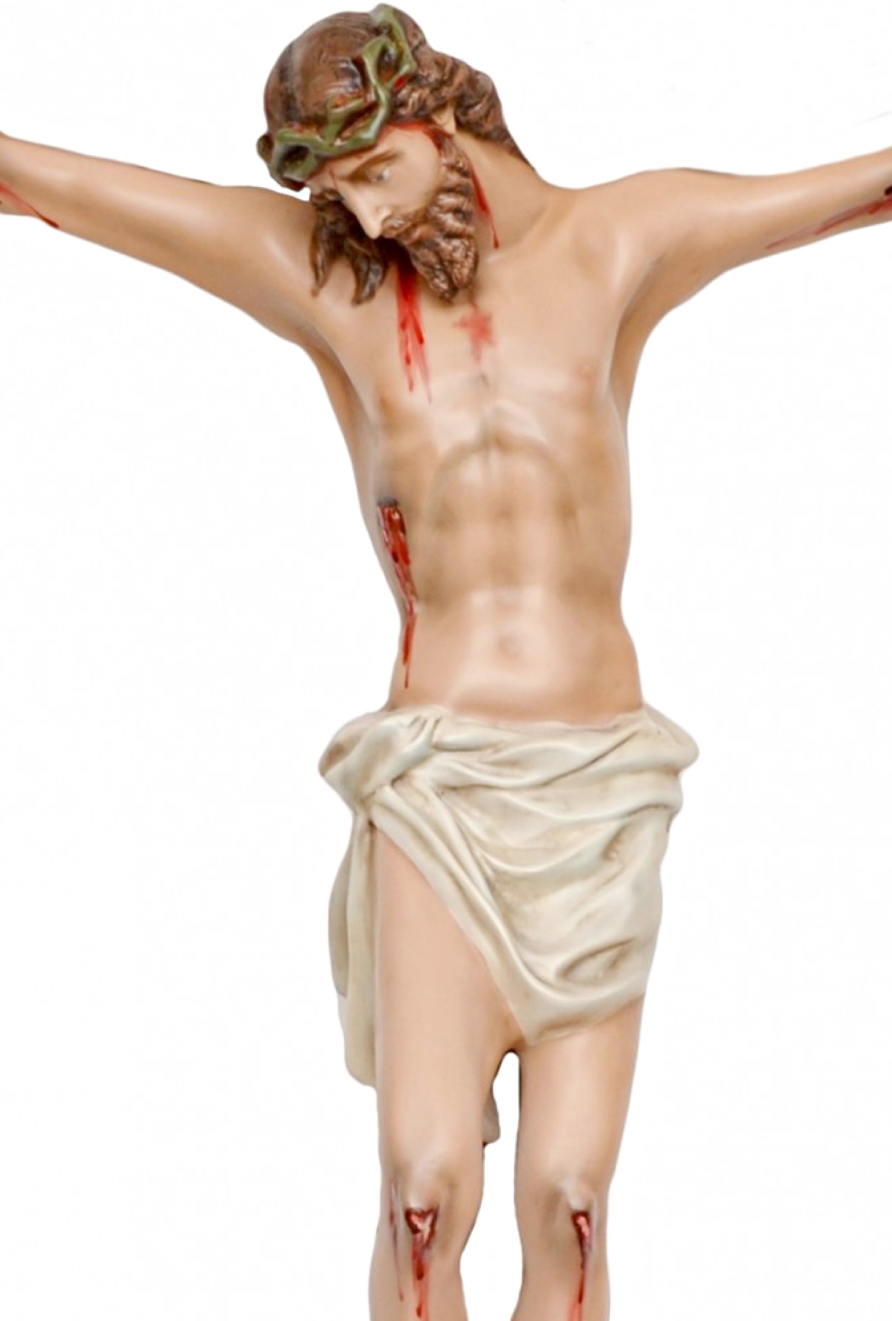 Crucifijo en fibra de vidrio, pintada a mano con colores al óleo.