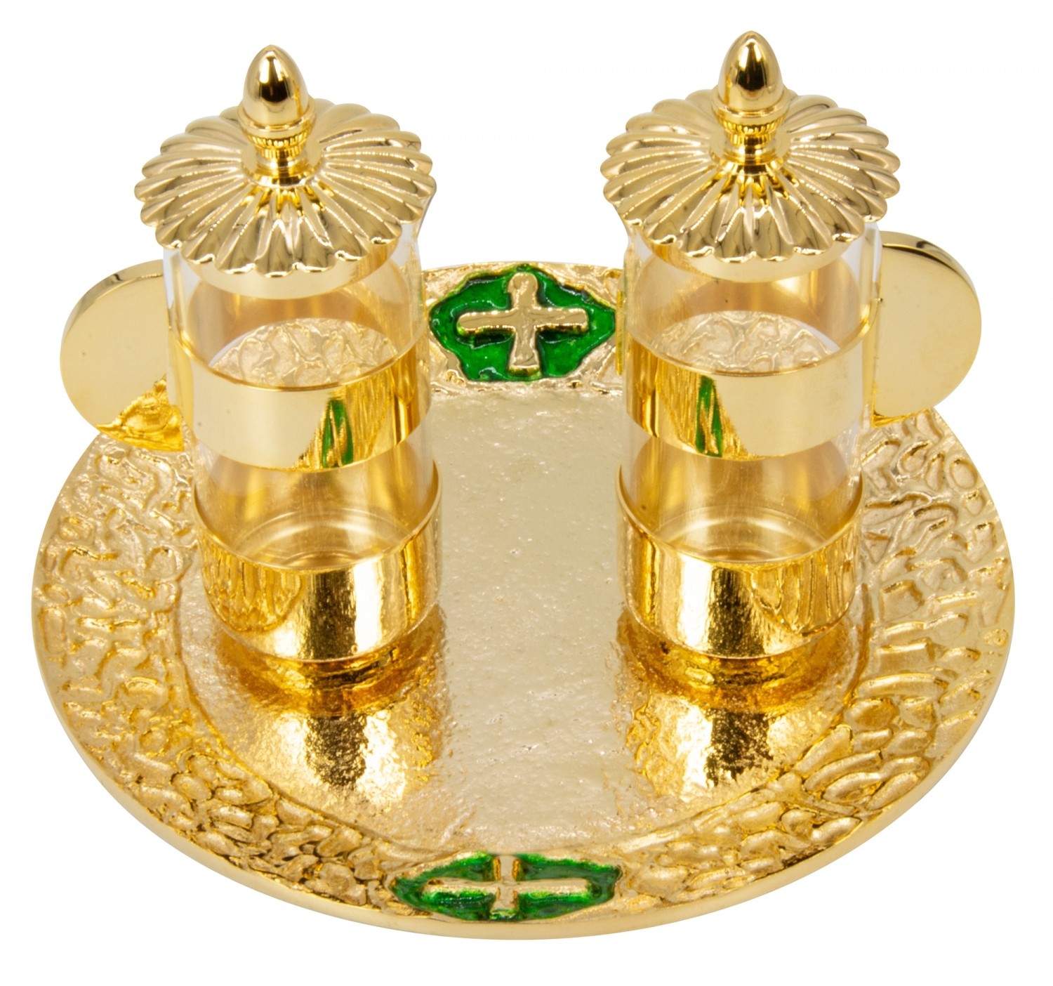 Dos ampollas de vidrio soplado se fijan sobre una bandeja de bronce fundido dorado.