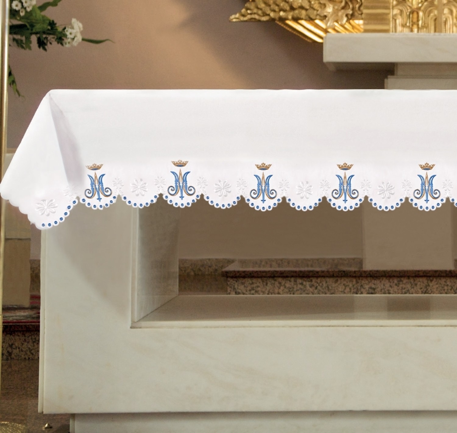 Mantel de altar con rico bordado de flores y símbolo mariano.