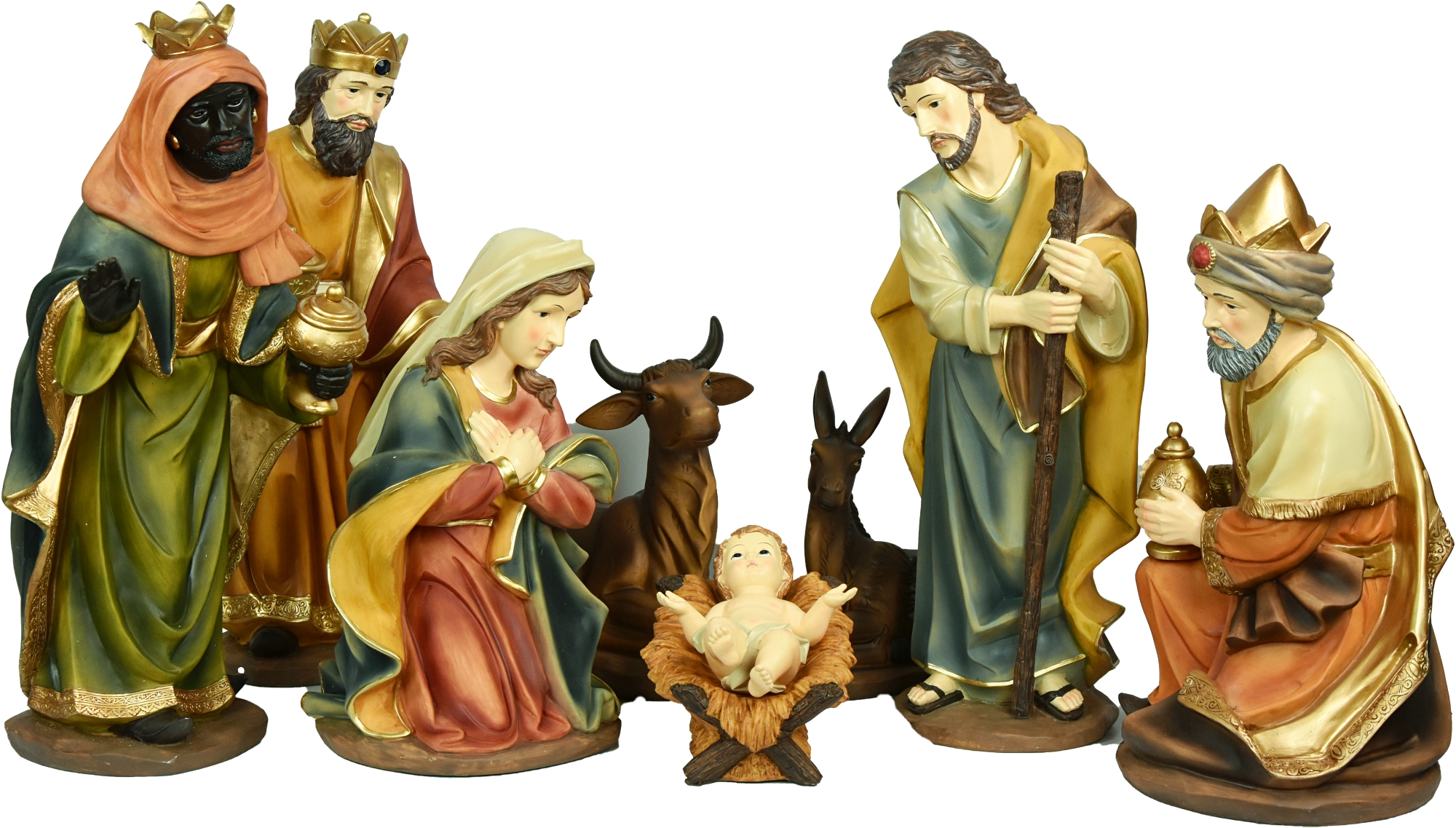 Belén completo con ocho figuras de resina similar a la madera.