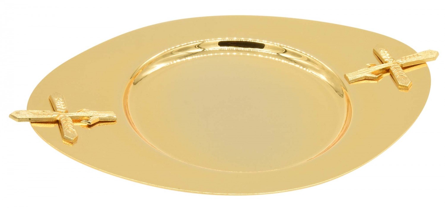 Patena comunion de latón de latón dorado con partes de bronce fundido.