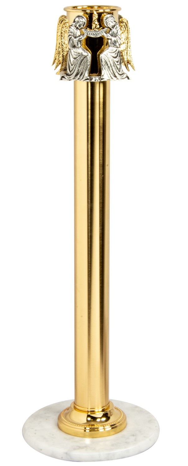 Porta cirio pascual, en latón dorado, con una rica fusión de dos parejas de ángeles fundidos.