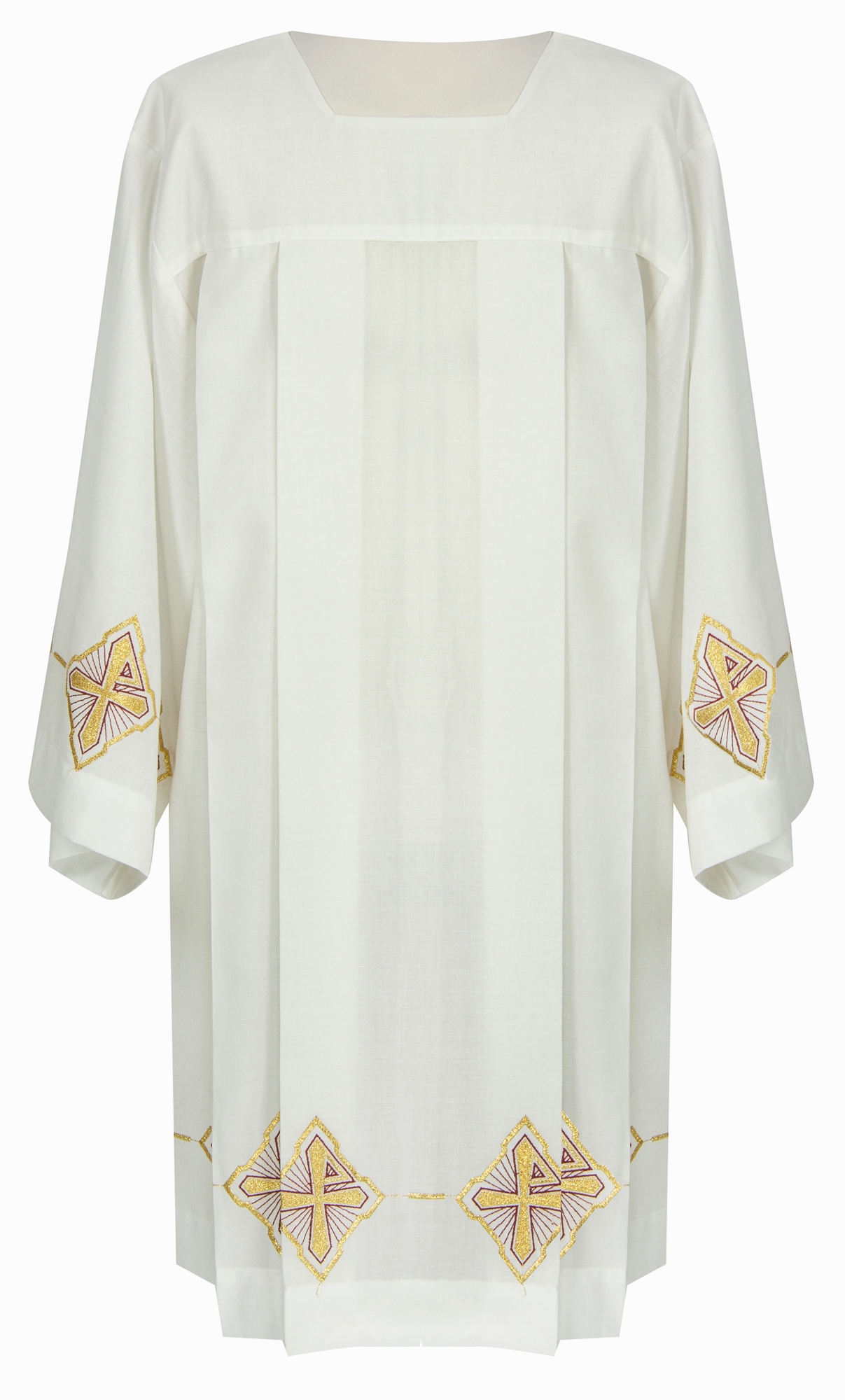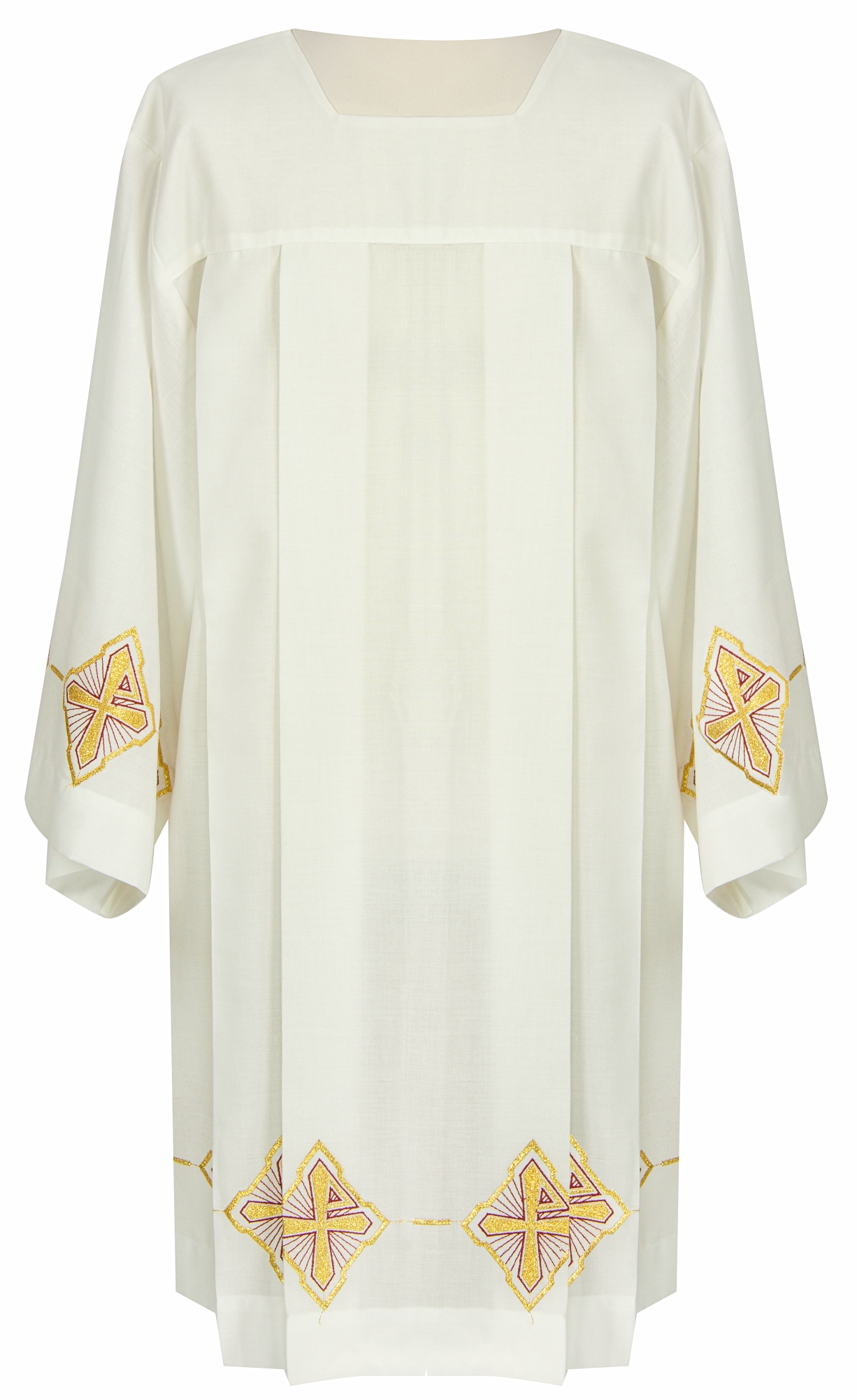 Presenta bordados de cruces doradas, ejecutados directamente en el tejido, en el dobladillo y las mangas.
