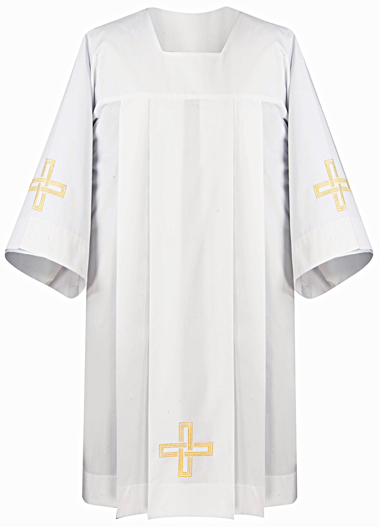 Decorado con cuatro cruces sencillas en el filo y dos en las mangas.