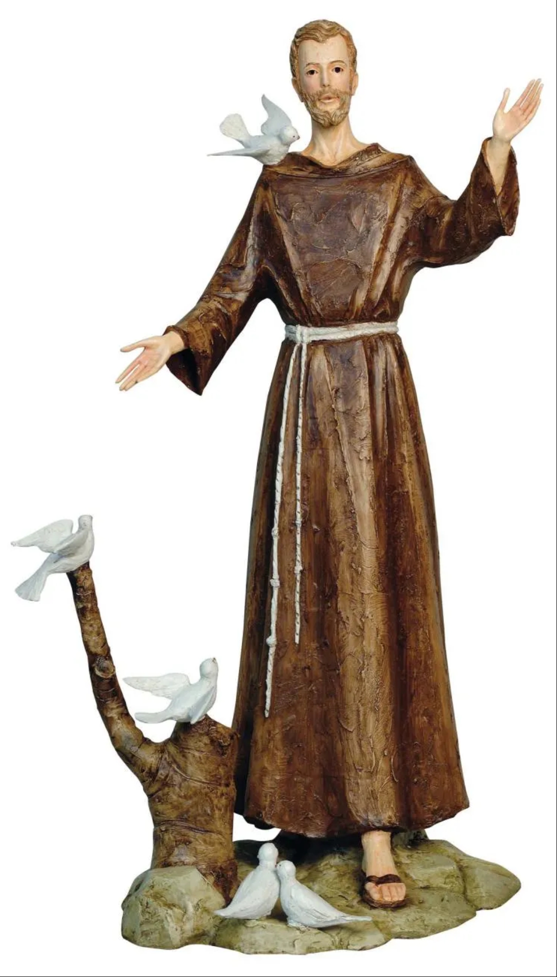 Interpretación moderna y original de la figura de San Francisco con palomas.