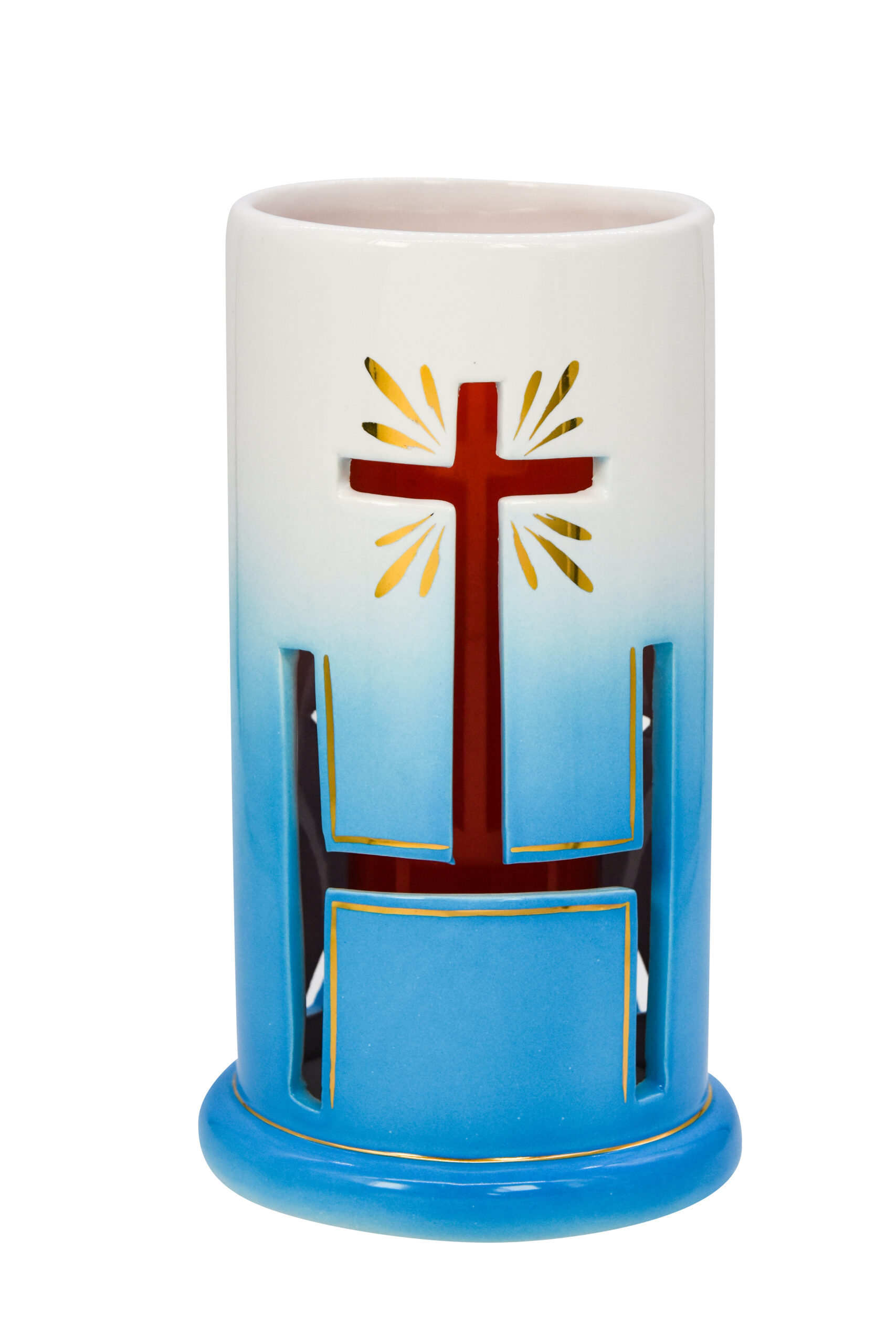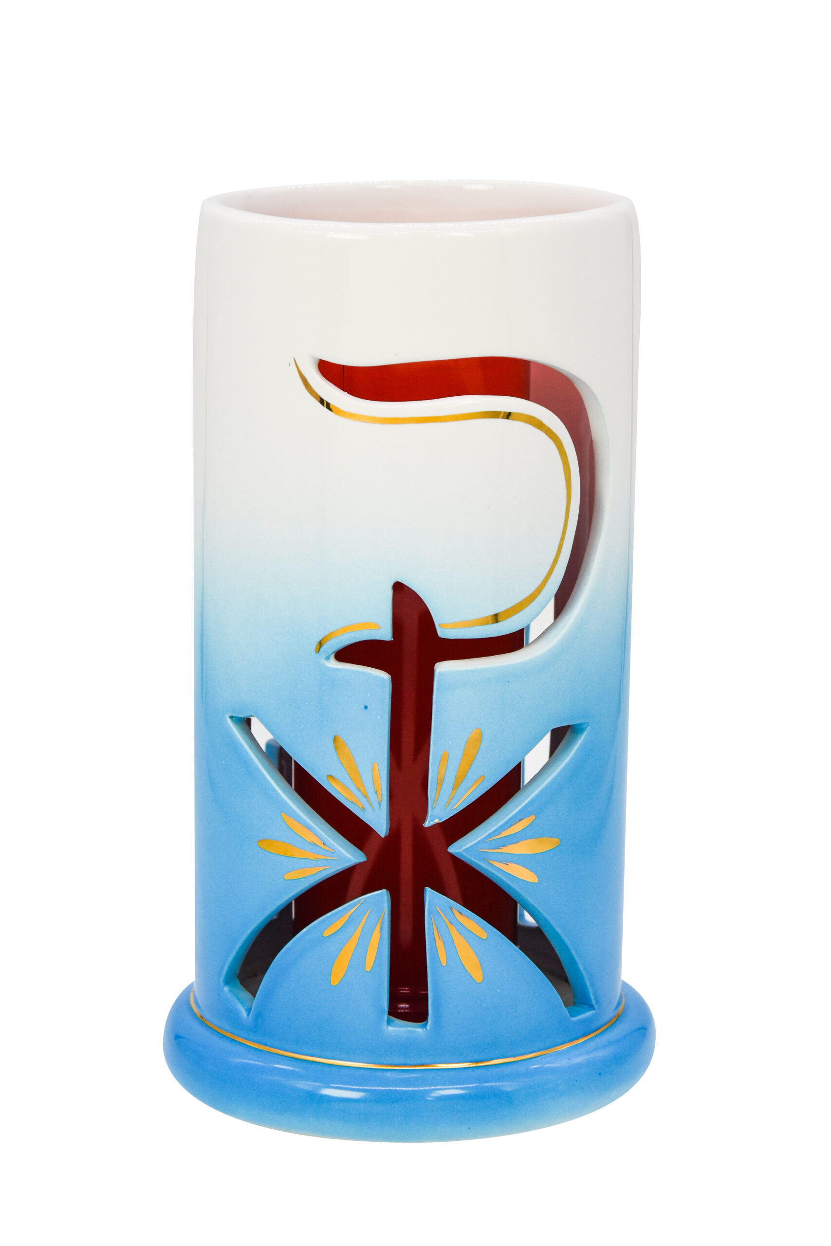 White and blue glazed ceramic altar sanctuary lamp with gold trim.