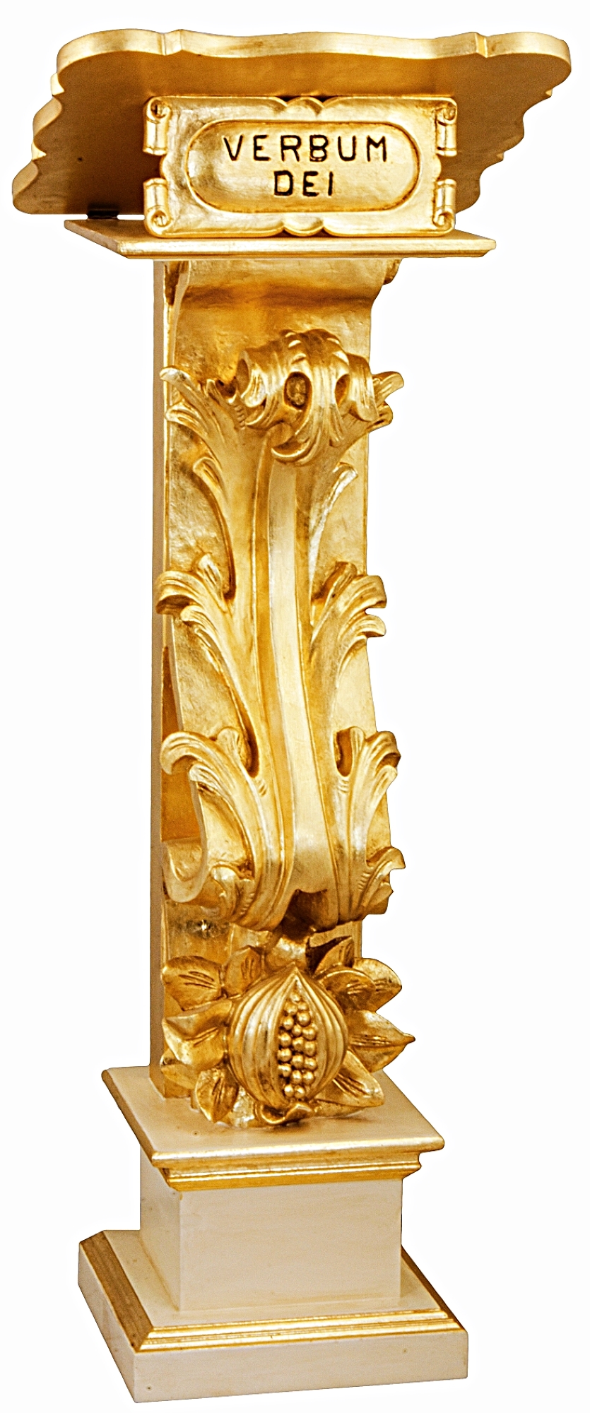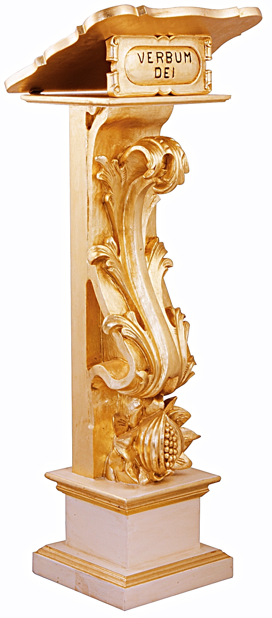 Il est composé d’une volute baroque, aux frises sculptées, qui supporte le pupitre.