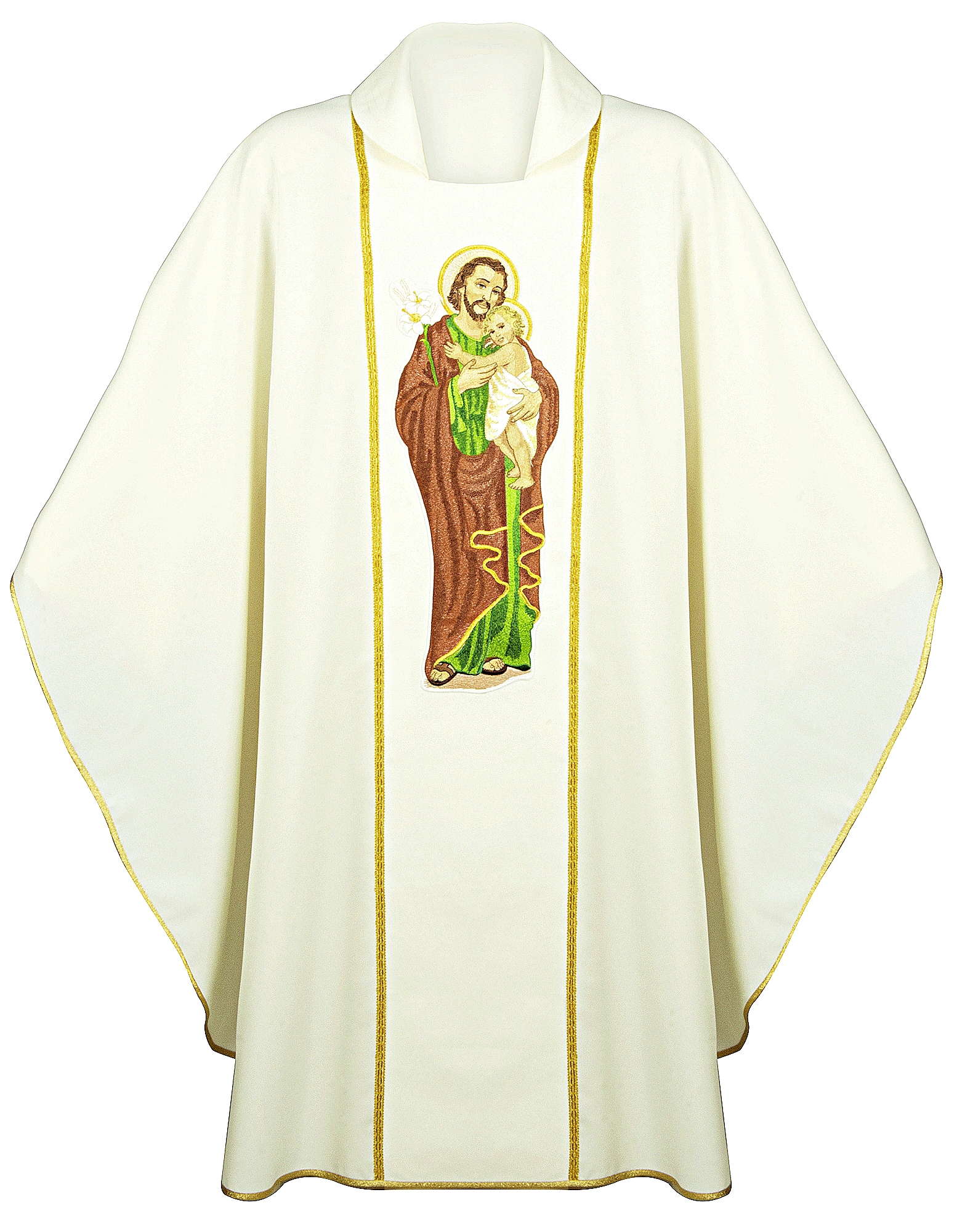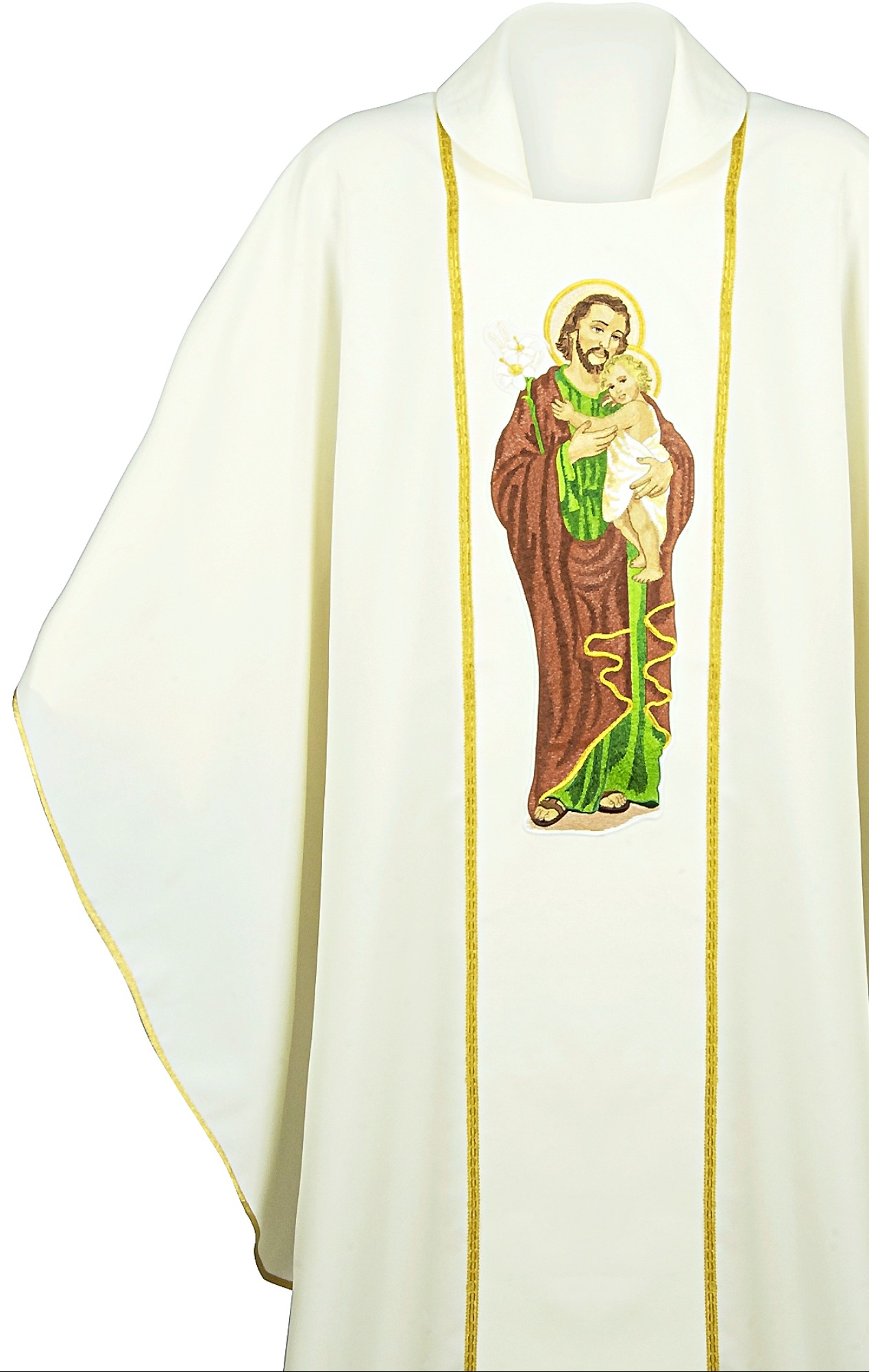 Application d’une broderie représentant Saint Joseph avec l’enfant.