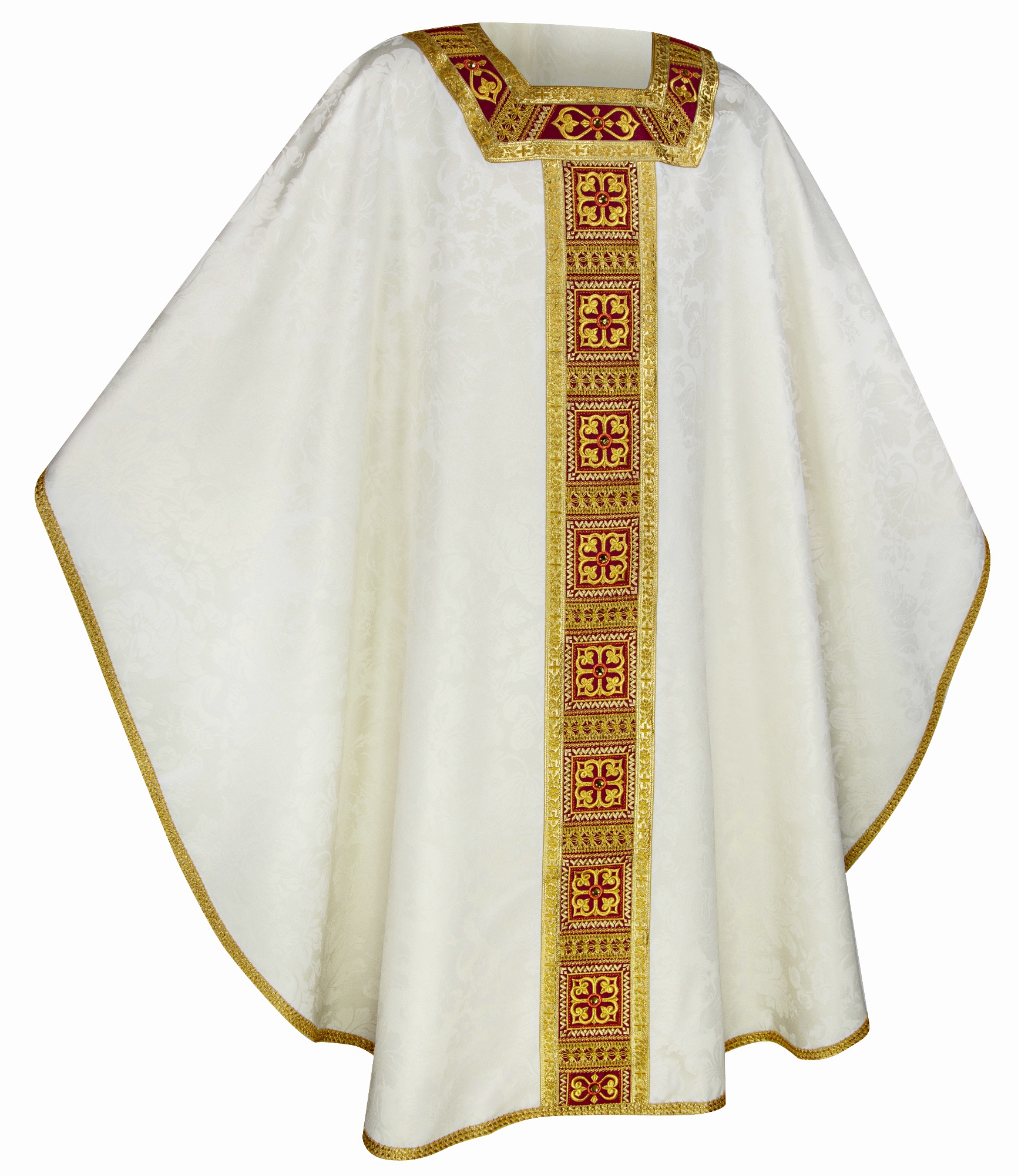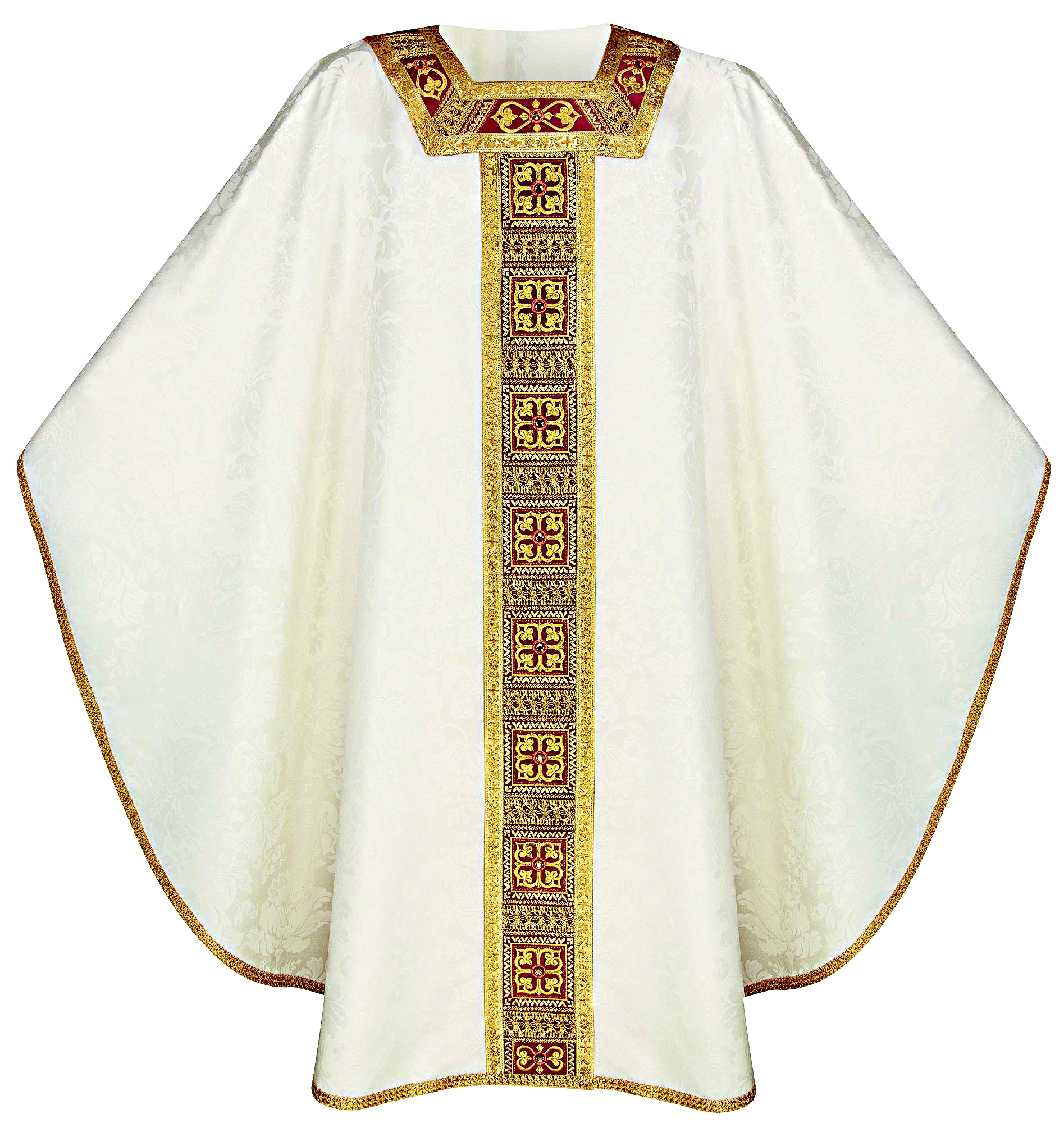Cette chasuble présente une somptueuse broderie en fil d’or, présente sur le col et dans la bande centrale, qui se répète sur les deux côtés, complétée par des strass décoratifs.