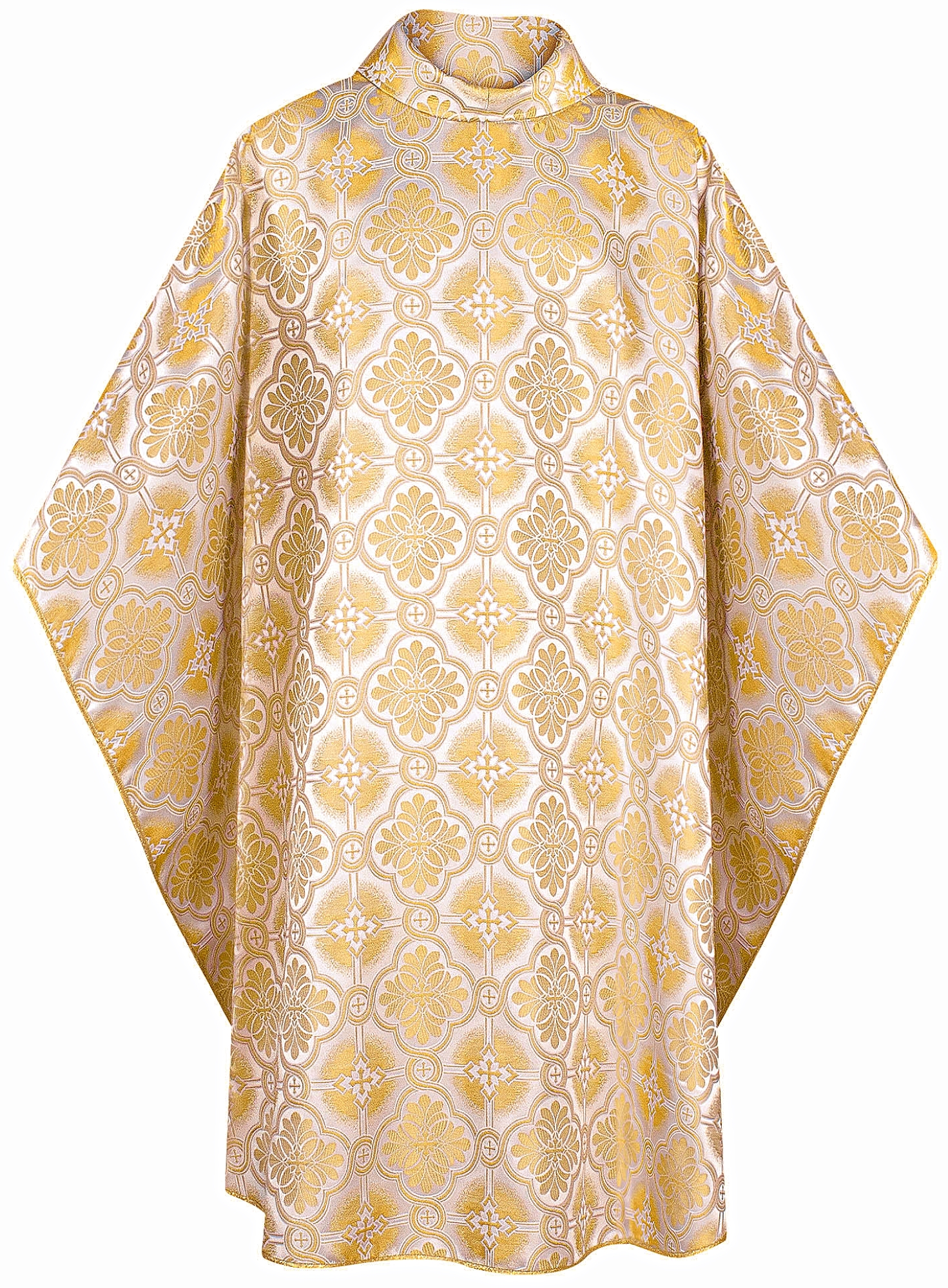 Un précieux tissu lampasso est utilisé pour la confection de cette chasuble ample et élégante.