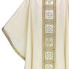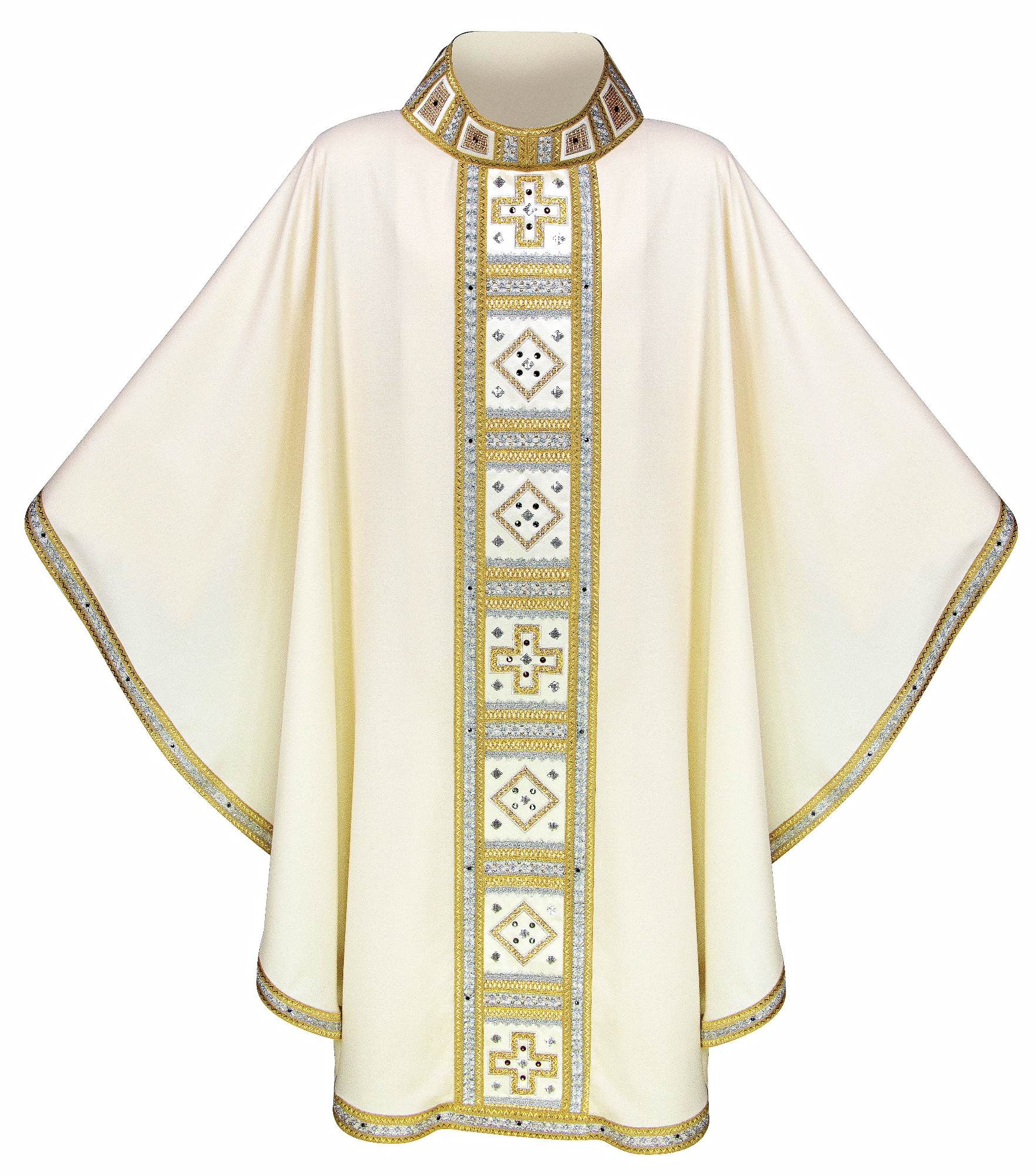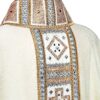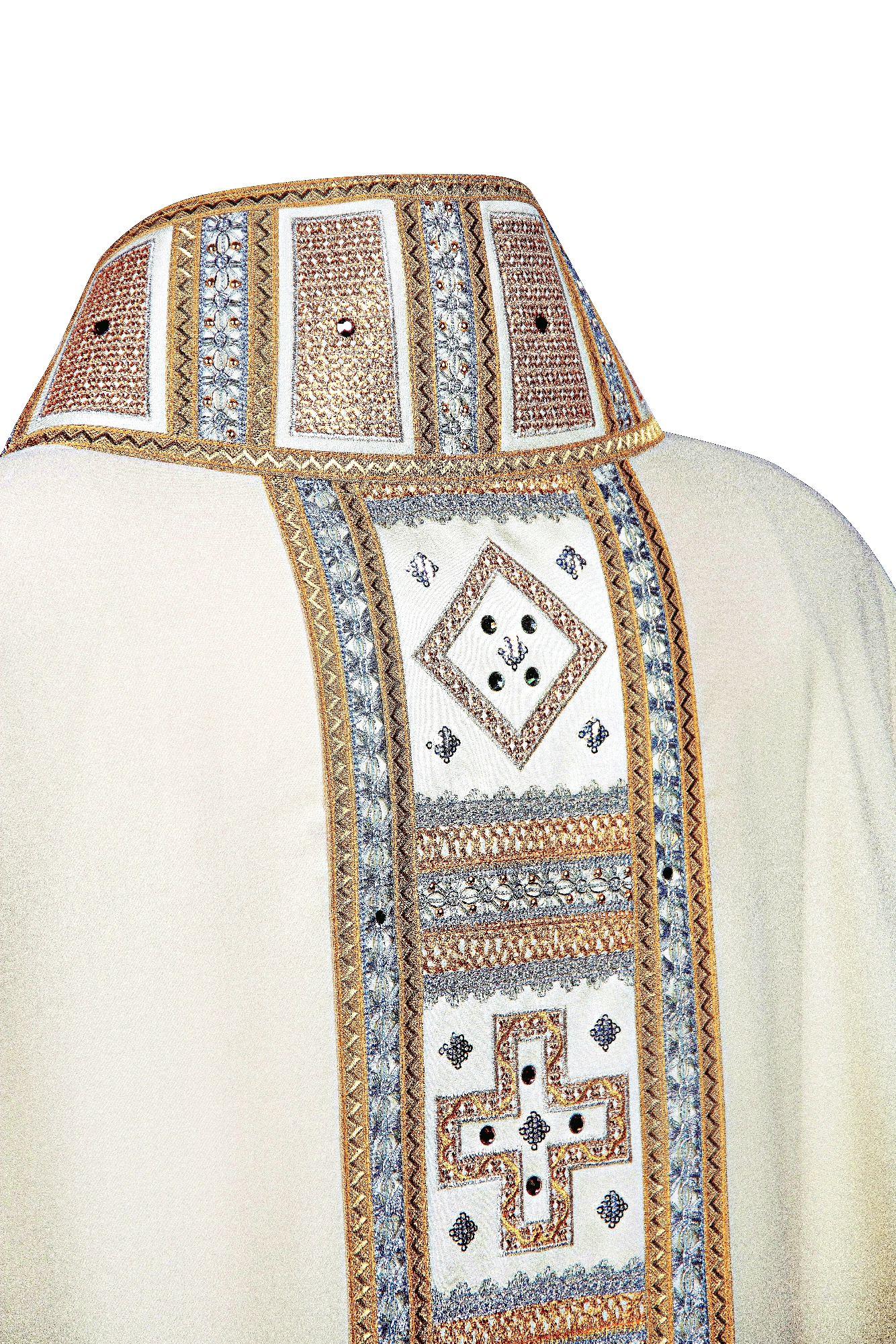 Une série de motifs brodés se développe sur les deux riches galons en satin qui se répètent sur les deux côtés de la chasuble realisé en très fine et légère laine saglia.