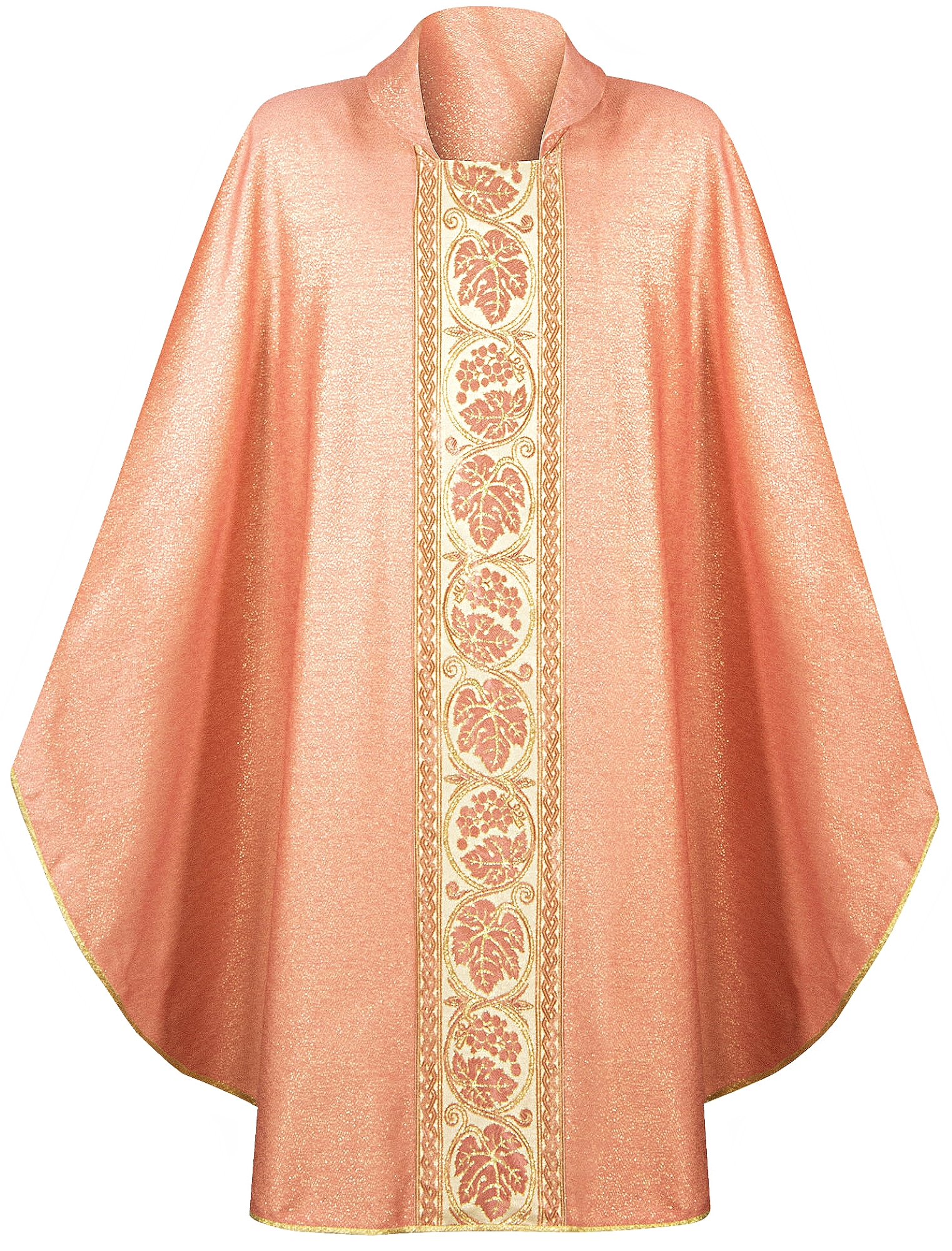 Chasuble confectionnée dans un précieux tissu de pure laine laminé or en couleur rose antique.