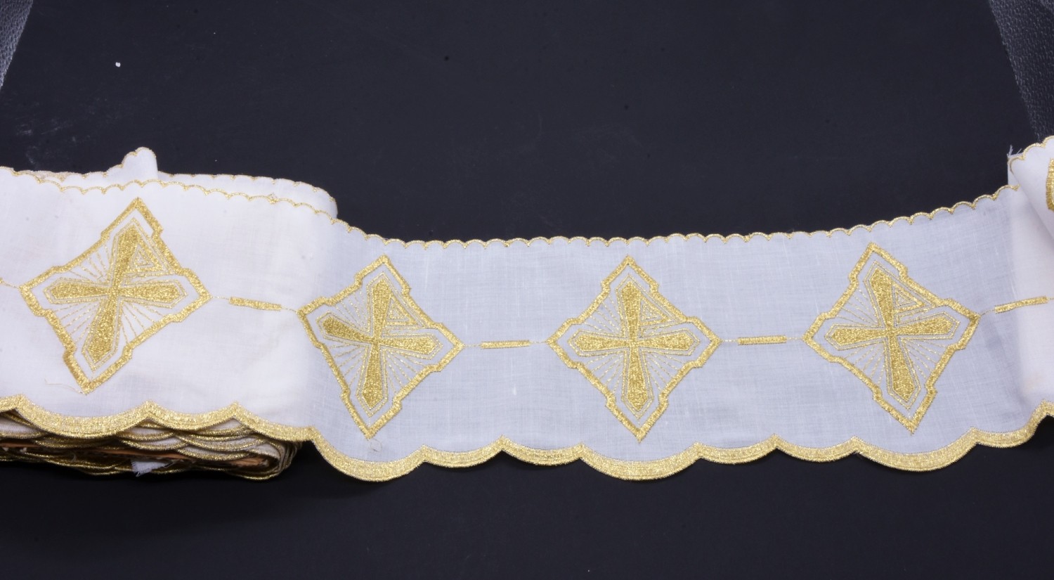 Dentelle pour nappe d’autel en tissu métis avec broderies de croix.