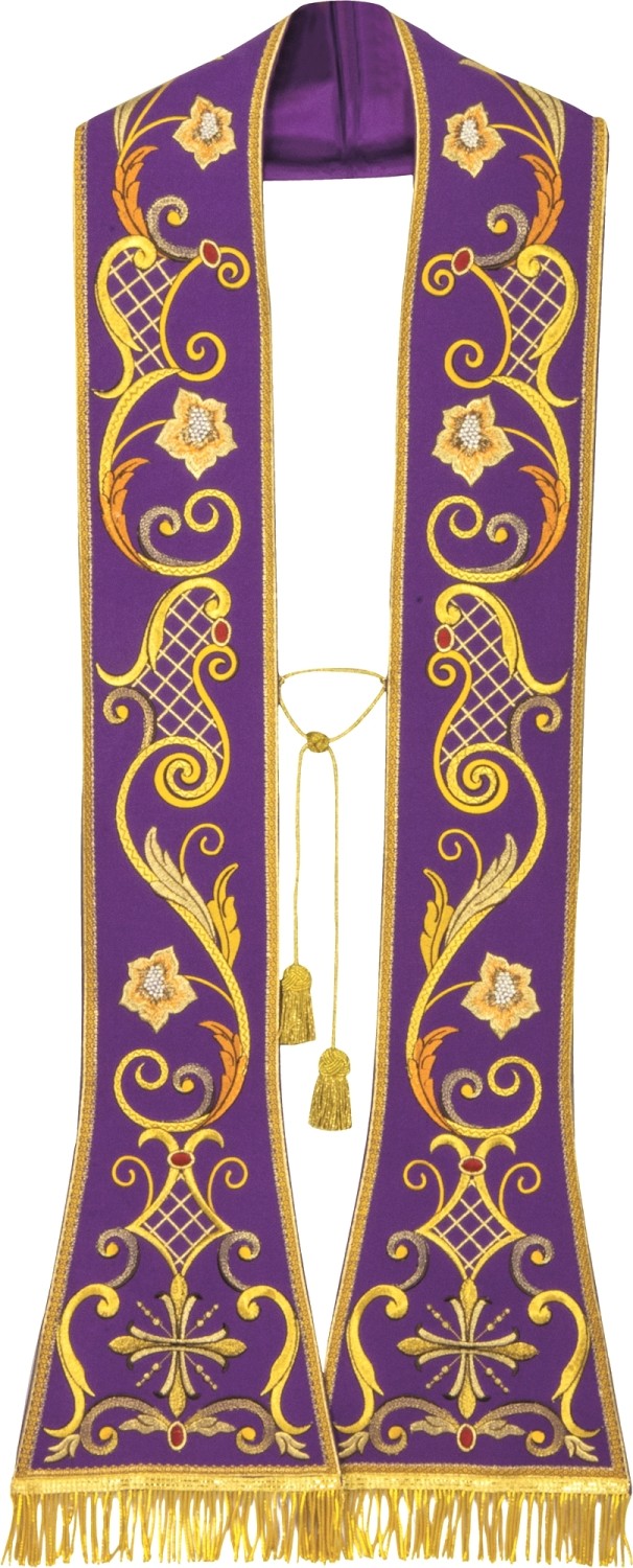 Etole entièrement brodée de fils dorés et colorés avec des ornements baroques.