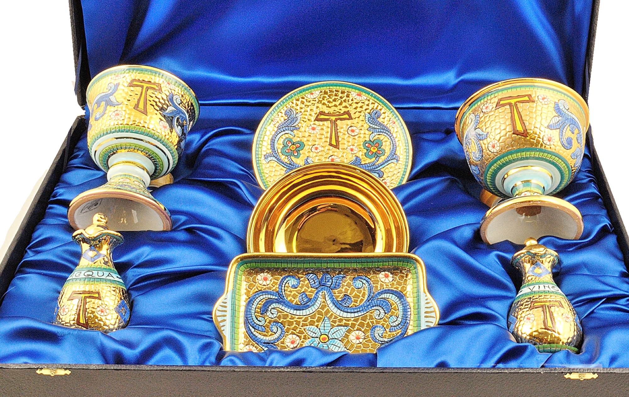 Un coordonné comprenant calice avec patène, ciboire, coupe-patène et service de burettes.