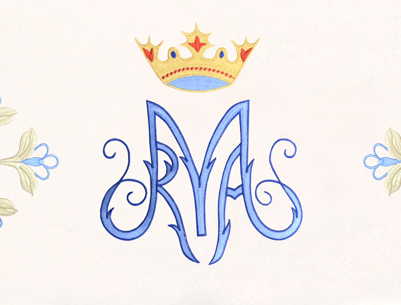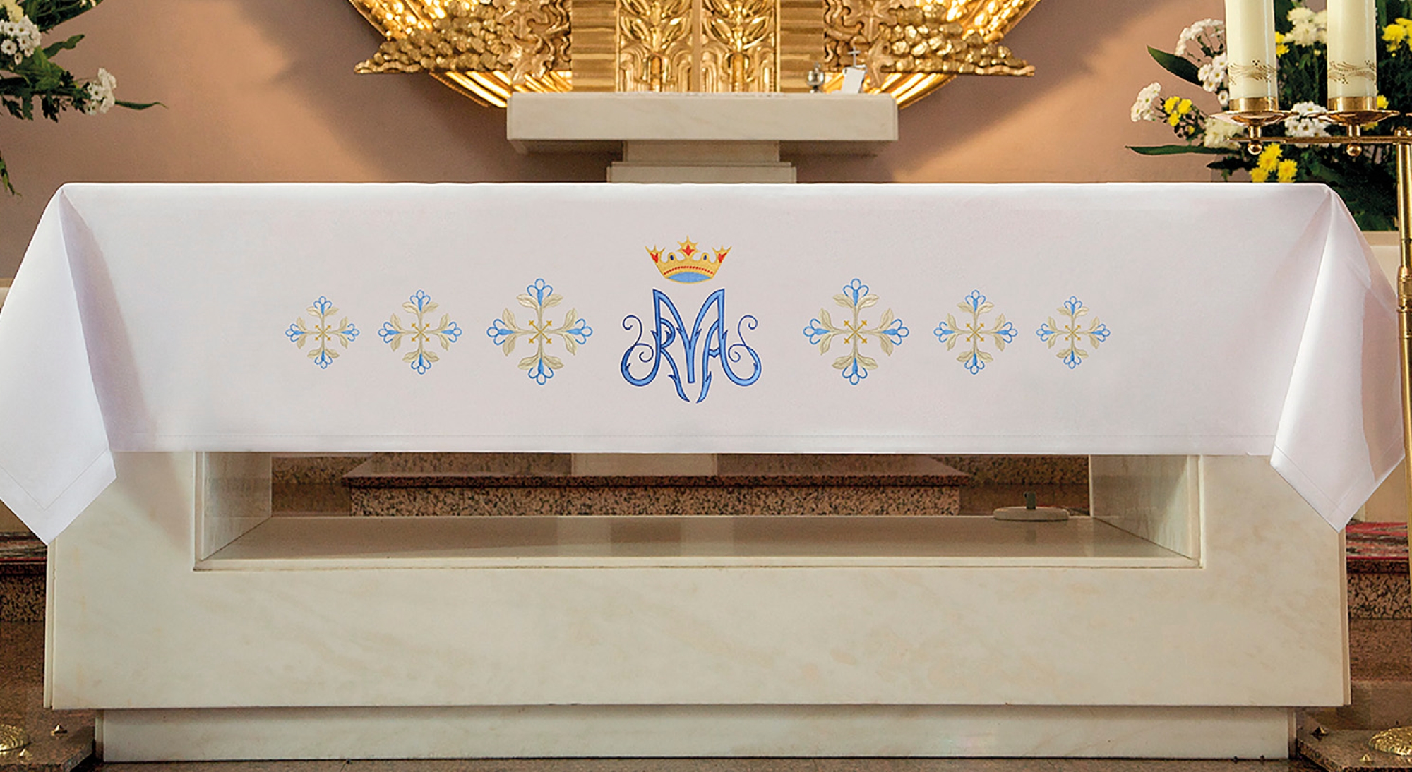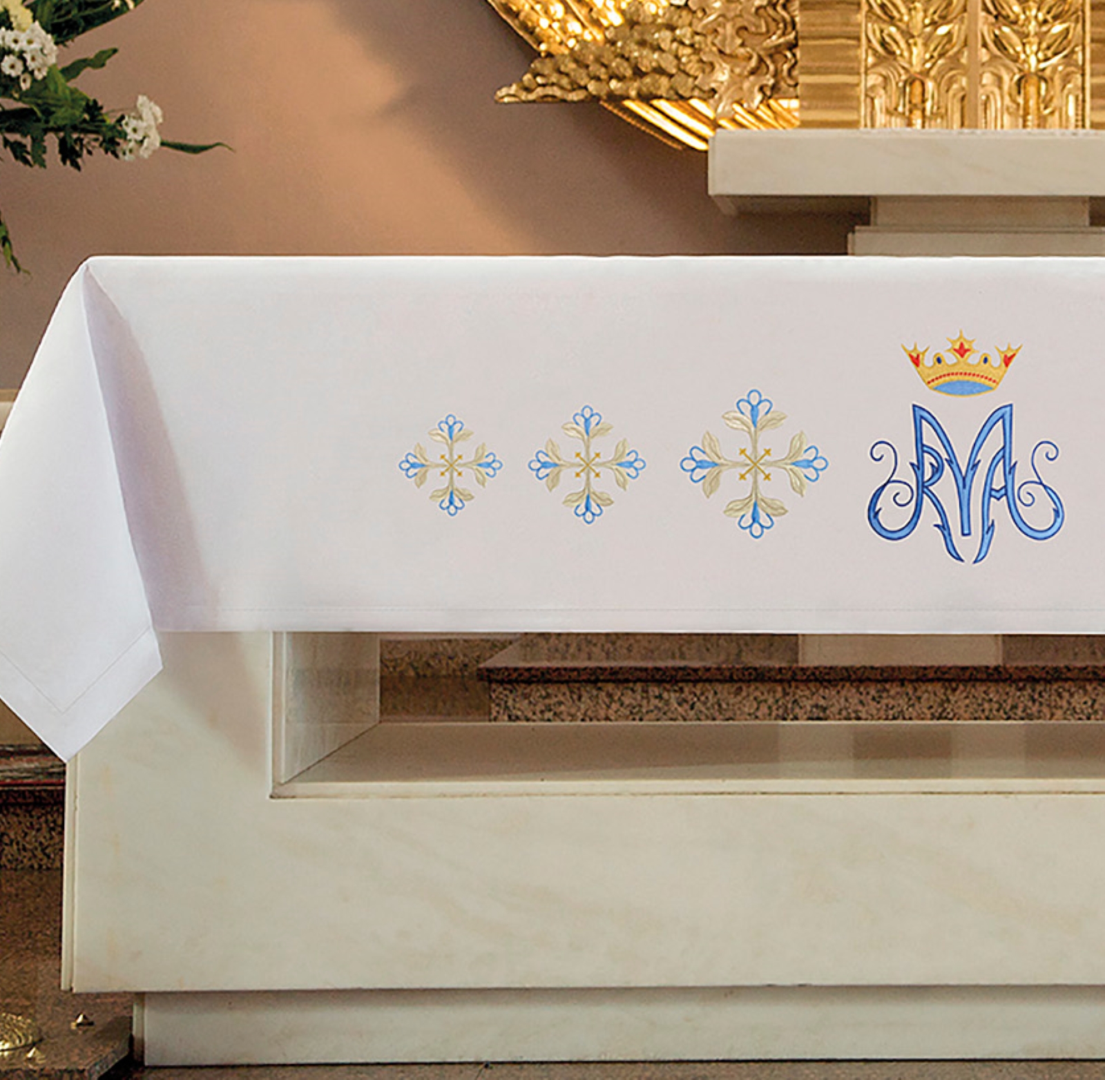 Nappe d’autel avec riche broderie de fleurs et symbole marial.