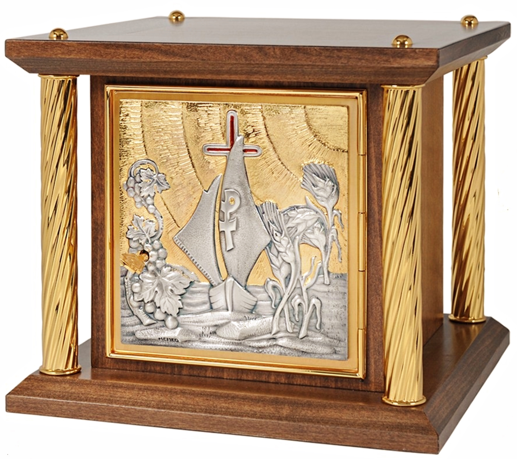 Porte en bronze coulé, doré et argenté, au ciseau de divers symboles liturgiques et eucharistiques.