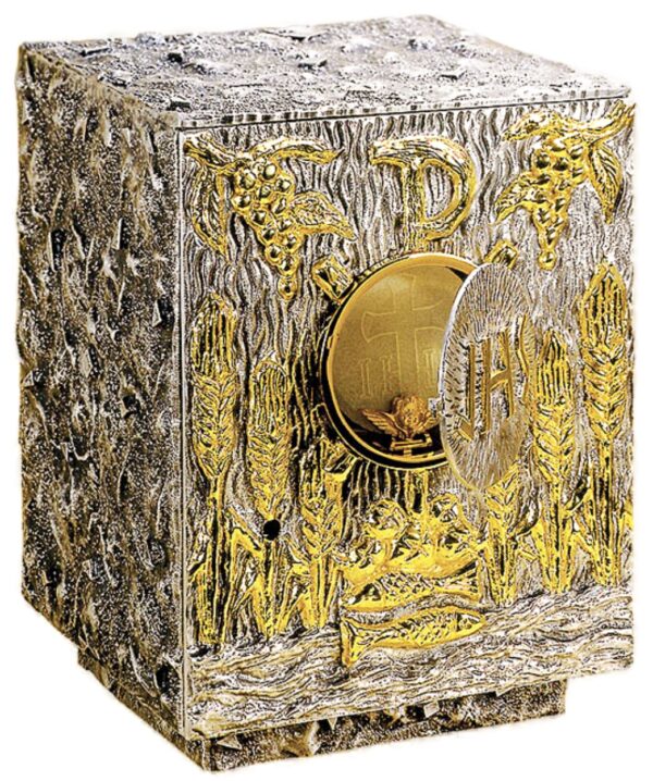 Tabernacle entièrement en bronze massif décoré de fusions de symboles Eucharistiques.