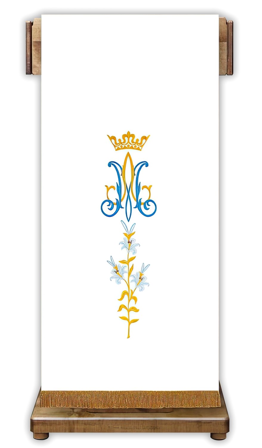 Voile de lutrin avec une riche broderie du symbole marial, lys et couronne royale.