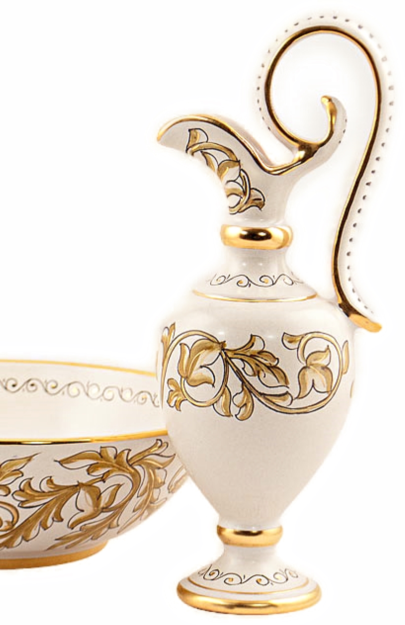 Brocca e catino in finissima ceramica con ricche decorazioni eseguite a mano in verde antico e oro.