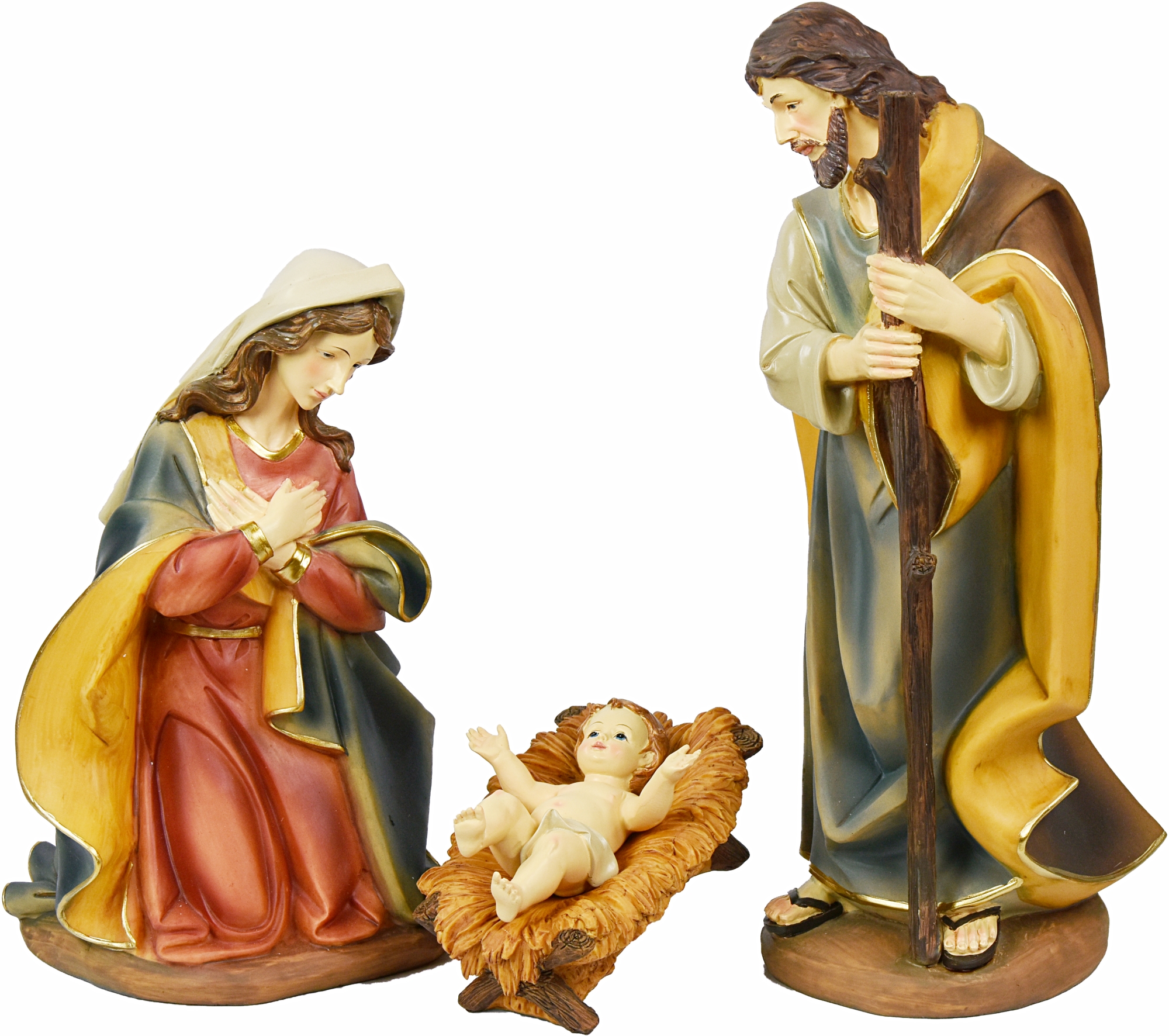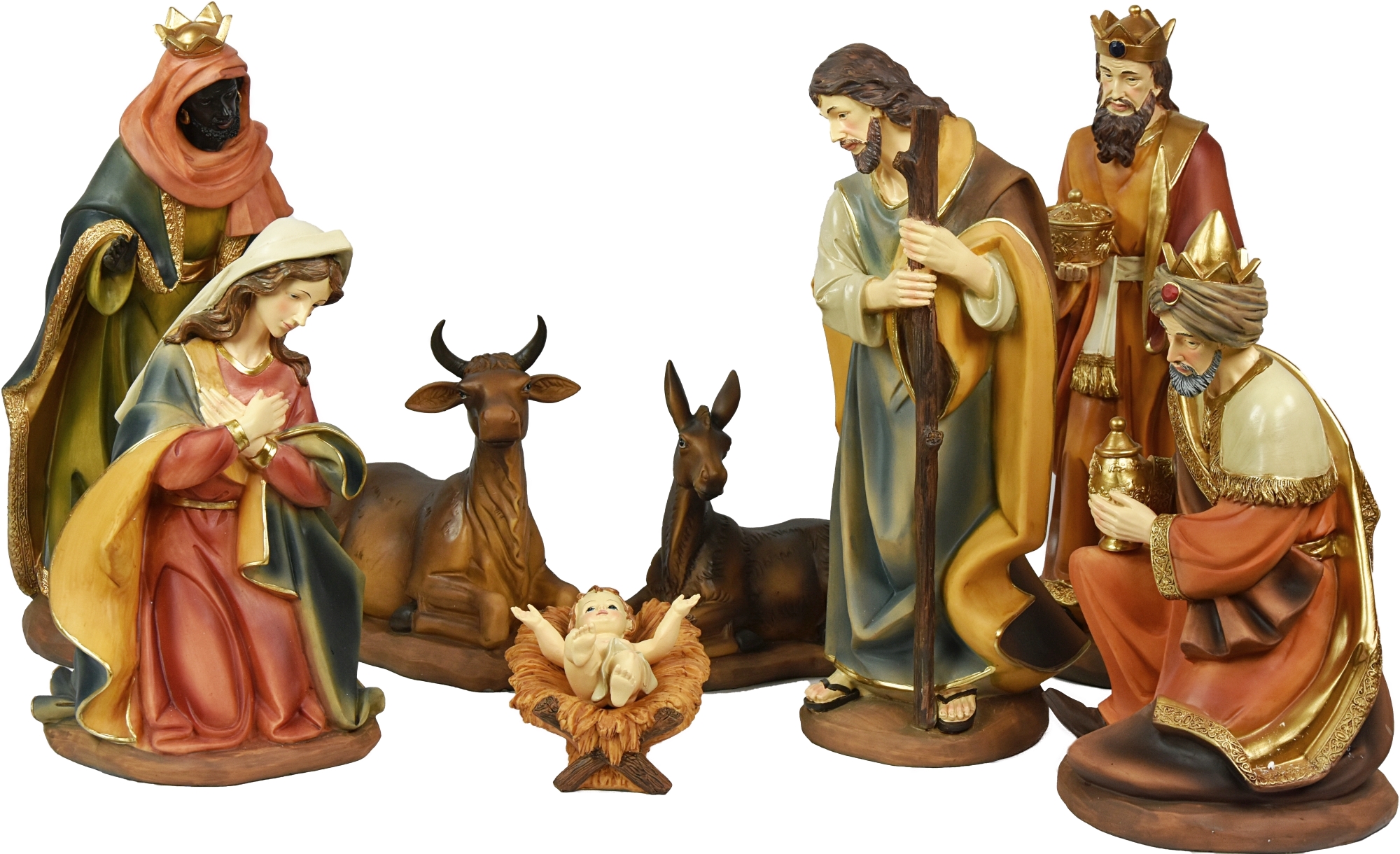 Gruppo Natività completo di otto figure in resina tipo legno.