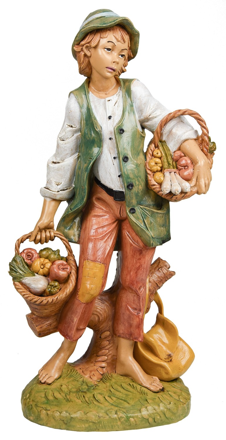 statua pastorello con cesti di verdura in lattice di gomma dura.