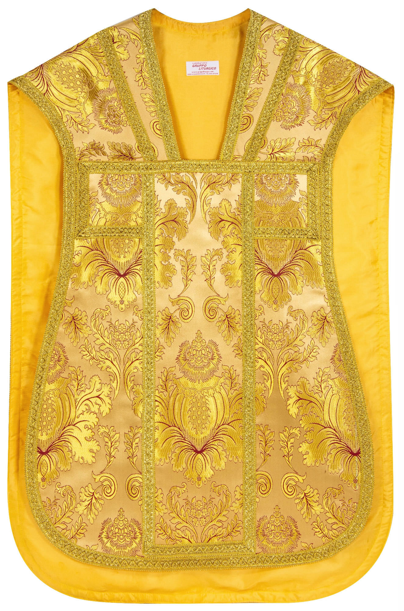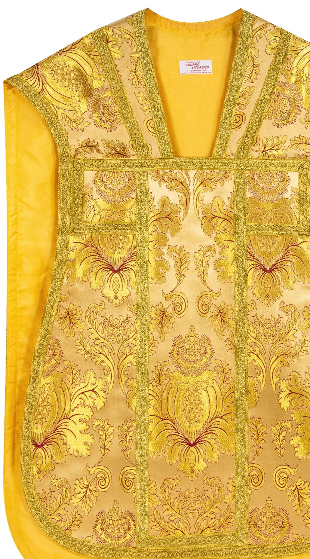 Meravigliosa pianeta confezionata con un pregiato tessuto broccato oro prodotto da un artigiano greco.