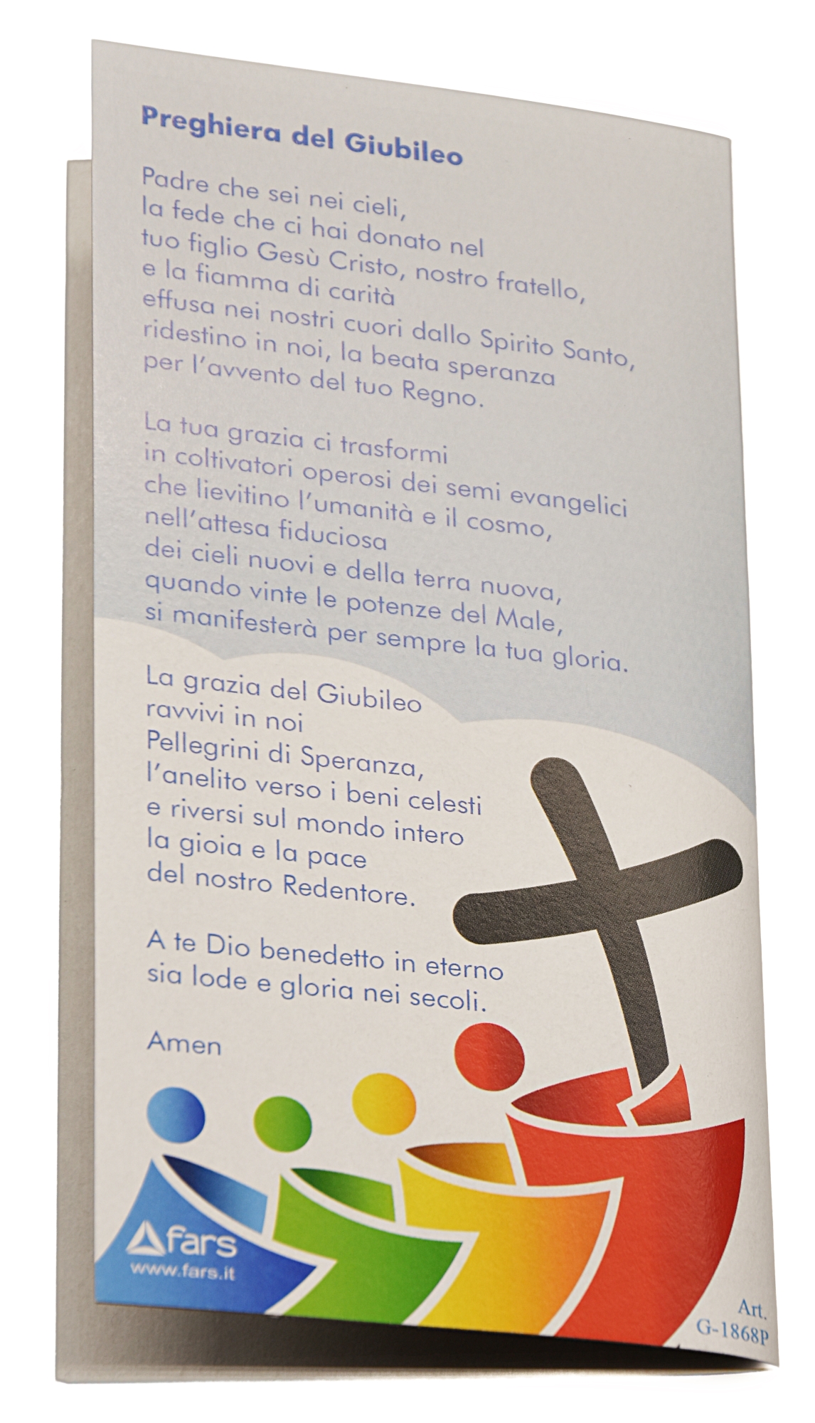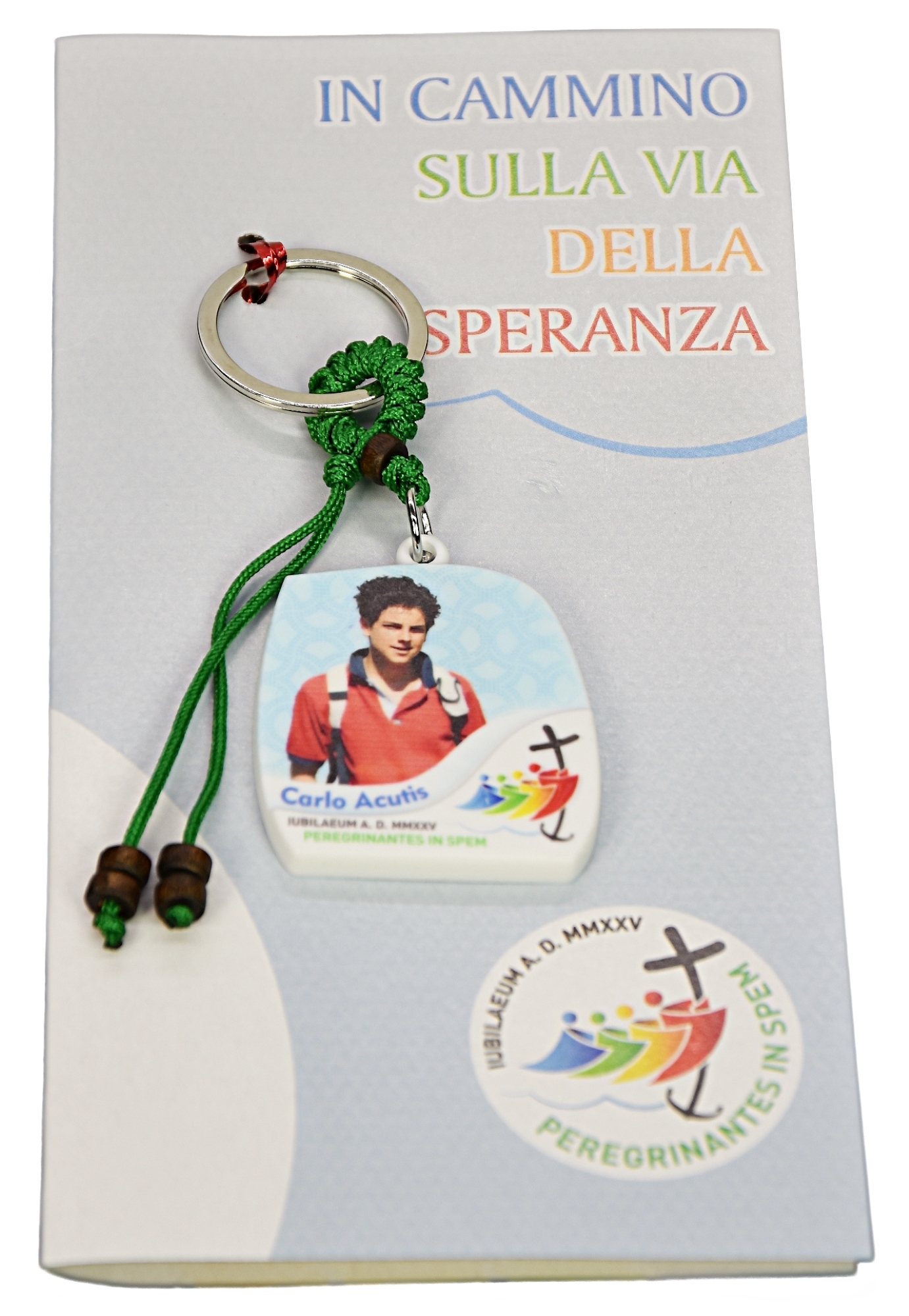 In resina serigrafata, presenta, oltre al logo ufficiale dell’Anno Giubilare, l’immagine del Beato Carlo Acutis la cui canonizzazione avverrà durante le celebrazioni dell’Anno Santo.