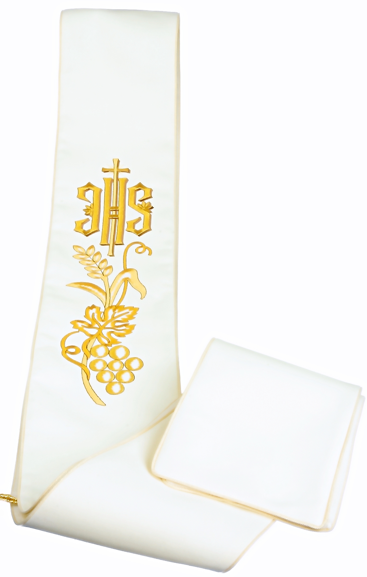 stola diaconale con delicati ricami di simbolo IHS, grappoli d’uva e spighe di grano.