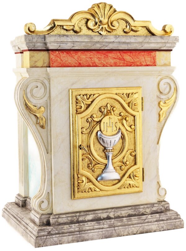 Porticina e fregi in legno scolpito a mano dorati ad oro foglia.